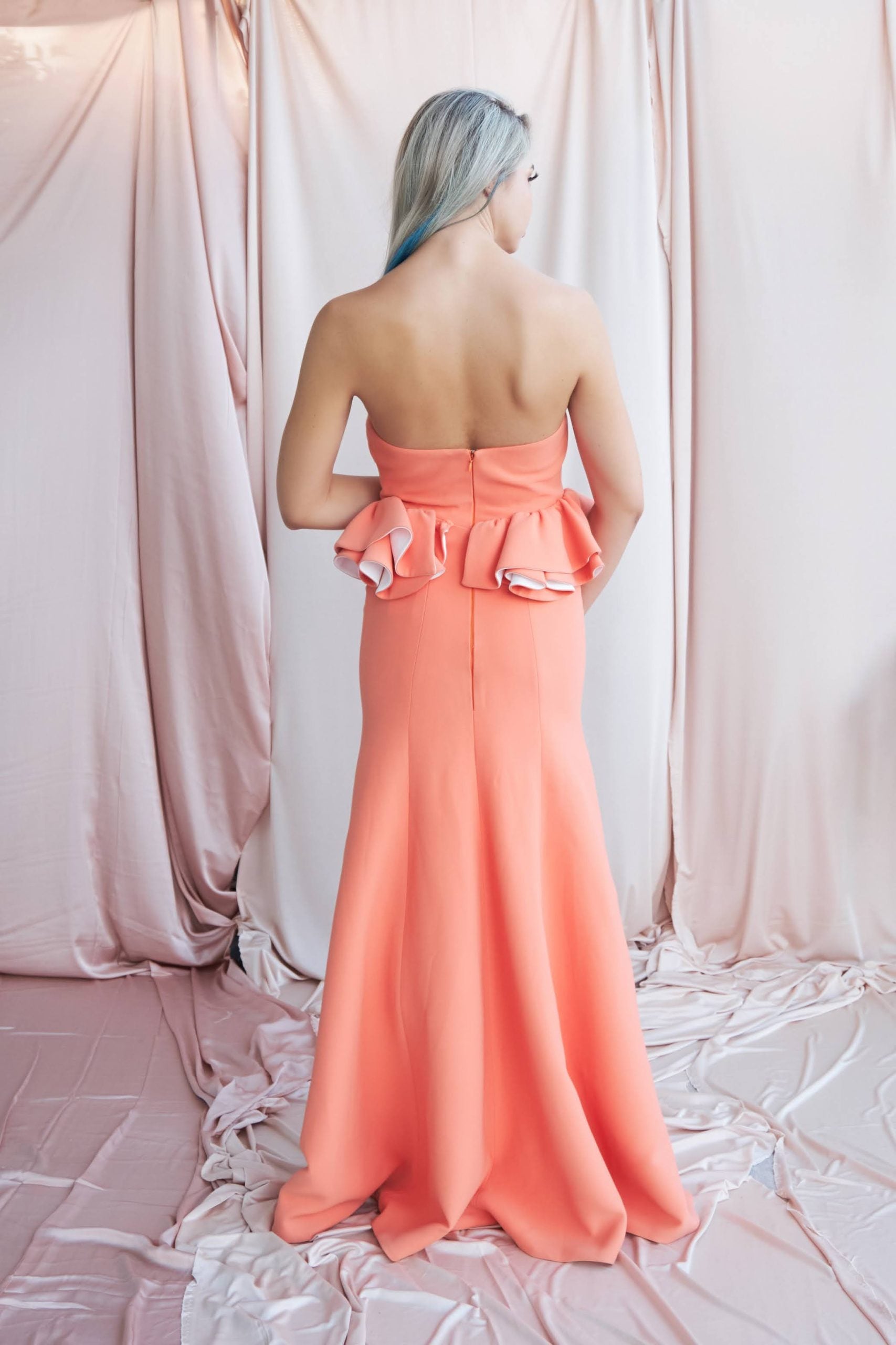 Şeftalinin en pudra tonunda straplez önü kısa arkası kuyruklu abiye modelimiz . Göğüs kısmında Beli tam saran korseli ve büstiyerinde dantel detaylı ,ayrıca daha görkemli bir bel kıvrımı için bel kısmında fırfır detayları mevcuttur. Astarlı ve vücudu saran likrasız bir üründür. Bu elbise özel davetlerde zarafetinizi ön plana çıkaracak şık bir seçim.