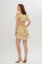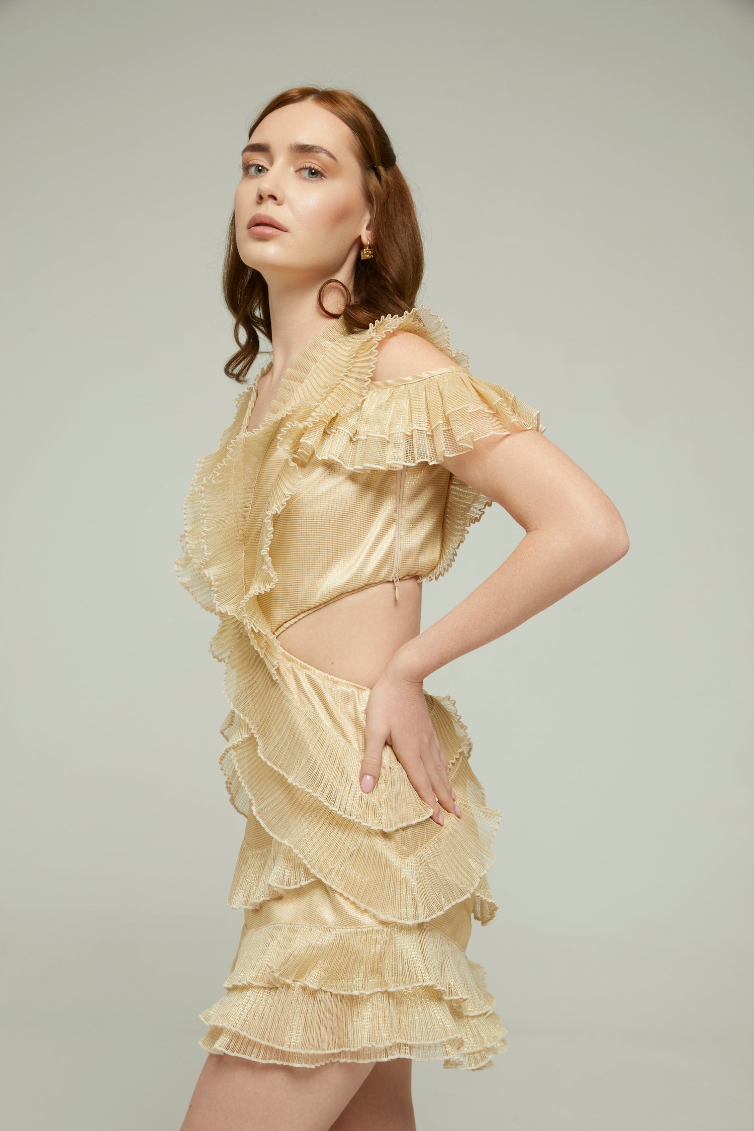 Gold fırfır detaylı mini Elbise . Elbisenin yanlarında ve arkasında yer alan kesimler ile zarif ve oldukça ince bir siluet görüntüsü veriyor . A Kesim eteğininde ve üstün belinde ise ince gizli lastik olması da elbiseye ayrı konfor sağıyor . Yanında gizli fermuar detayı ile rahat kullanış için özenle üretilmiştir . Likrasız ve Astarlıdır . Sezon ne olursa olsun pek çok yere etkinliğe uyum sağlayabilecek güçlü ve göz alıcı bir seçimdir. Sadece sınırlı sayıda üretilir.