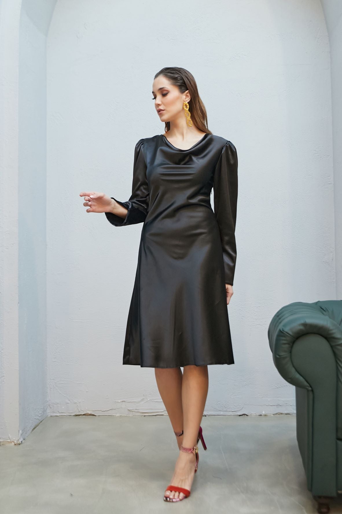 Amora A-kesim her kadının dolabında bulunması gereken siyah midi boy elbisemizdir. Rahat kesimi ve hafif balon yırtmaçlı uzun kollu oluşu tüm davetlerde zarif görünmenizi sağlayacaktır.