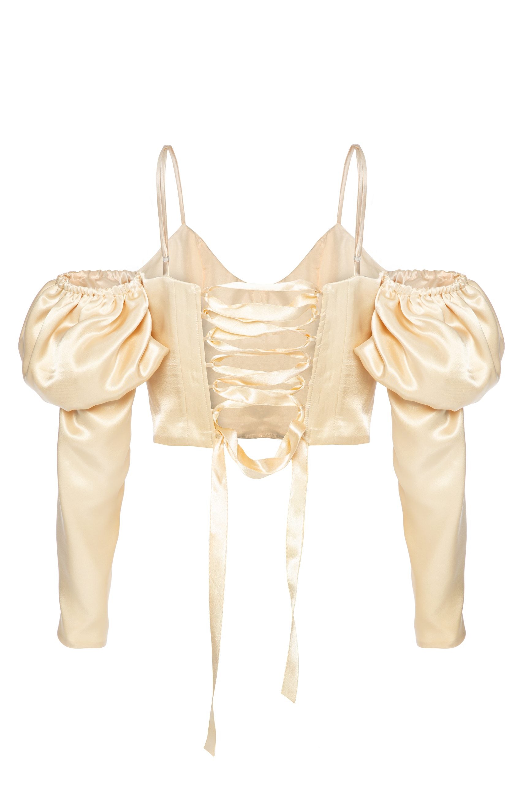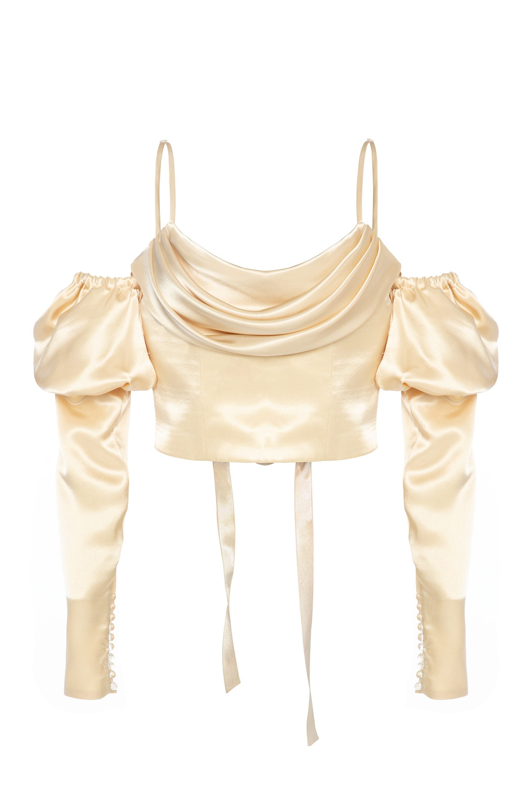 Şampanya renginde, korseli, sırtında bağlama detaylı büstiyer günlük kullanım için kot pantolon ile yada dilerseniz daha şık görünüm için takım olarak kombinleyebilirsiniz. Narin ipek saten kumaştan üretilmiştir. Kolları yandan düğme detayı ile kolayca çıkarılabilir . Astarlı ve likrasızdır. Bu parça, girdiğiniz her ortamda ışıldamanız için tasarlandı.