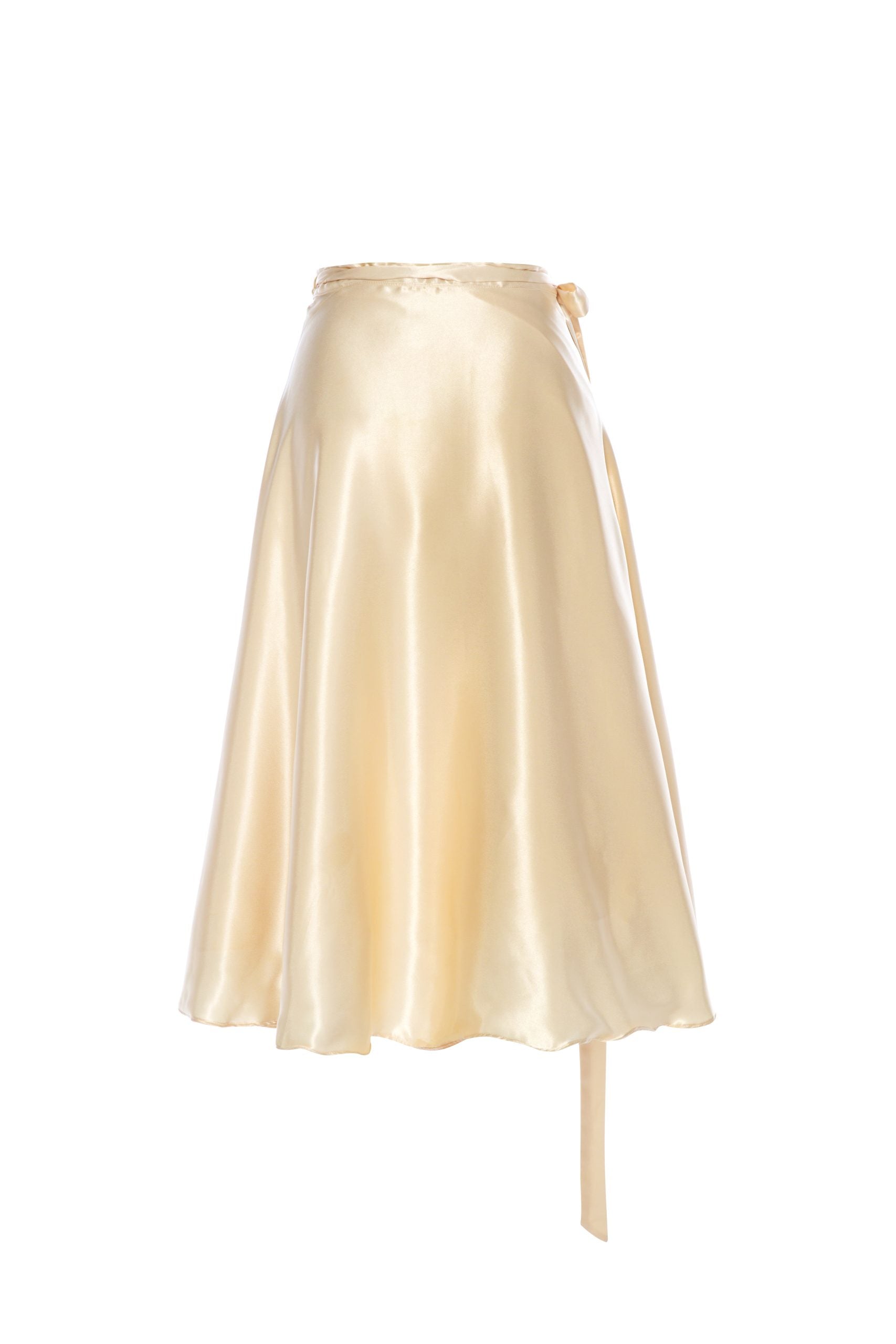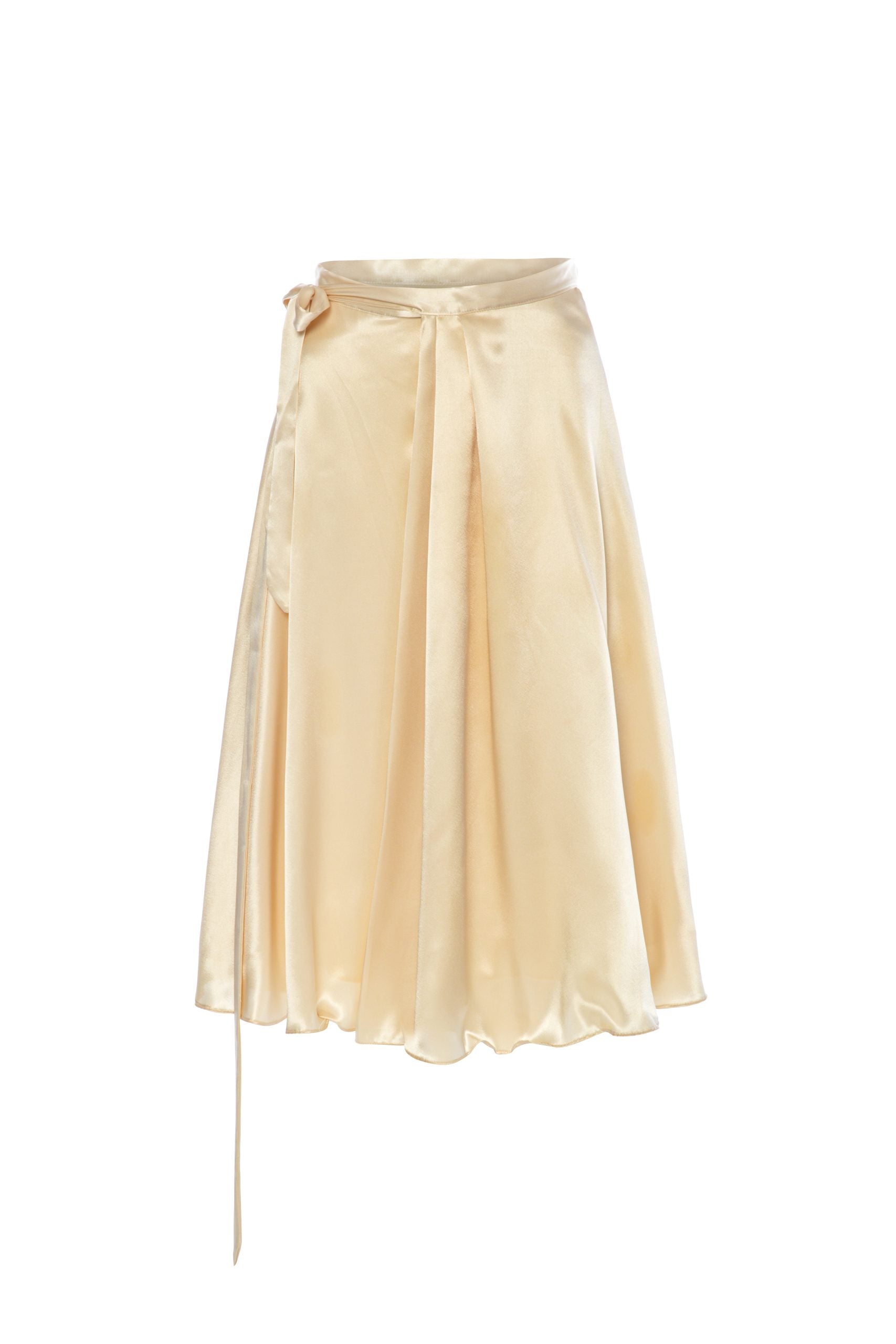 Şampanya renginde etek, anvelop kesim olup belinde kendiliğinden kuşağı ile istenilen rahatlığa ayarlanılabilir, önünde asimetrik gizli yırtmacı mevcuttur. Narin ipek saten kumaştan üretilmiştir. Astarlı ve likrasızdır. Zamansız şıklığı sevenler için özel olarak hazırlandı.