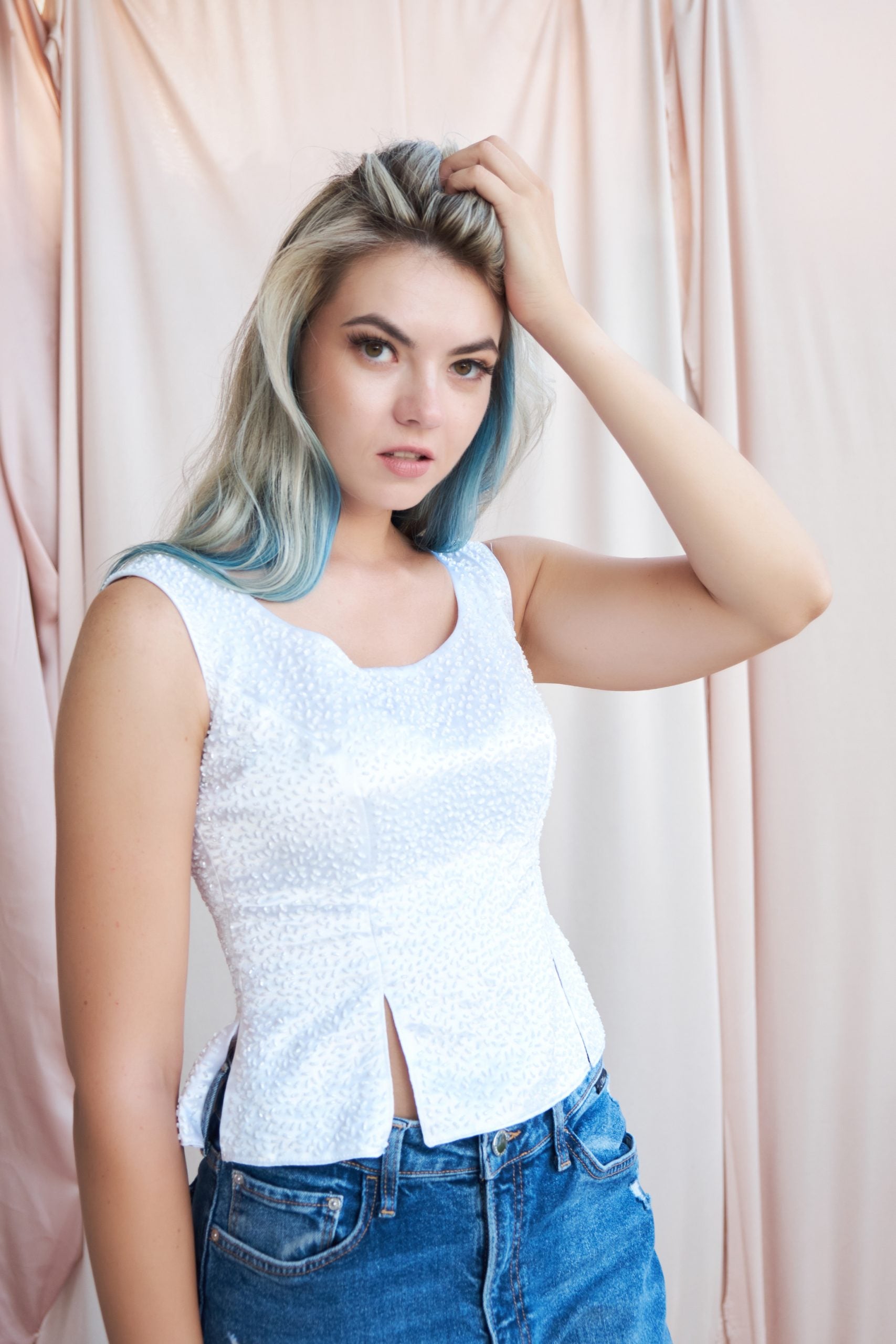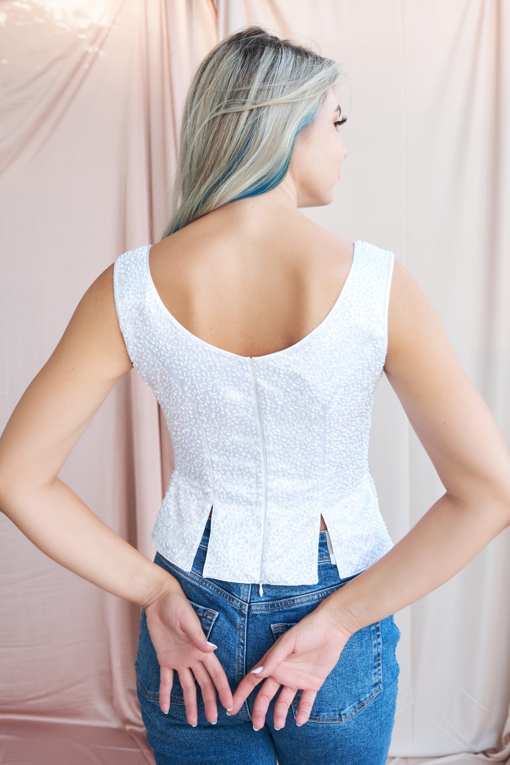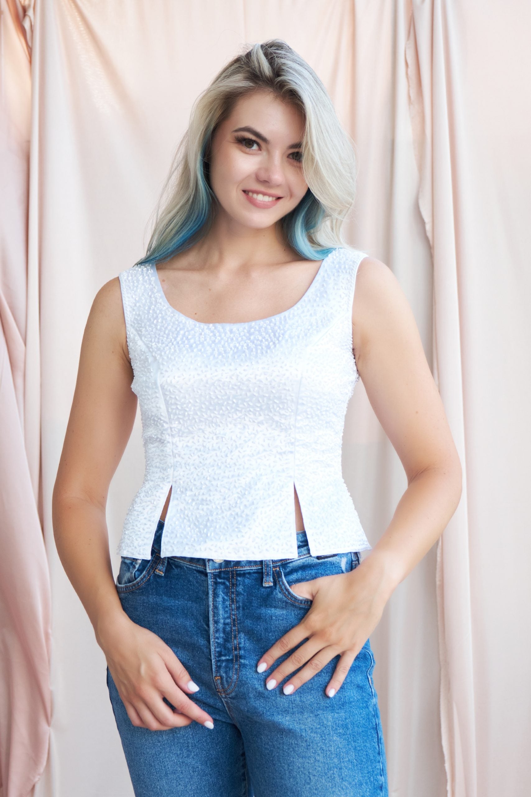 Tamamı ince kesme boncuk İşlemeli italyan ipek saten kumaştan üretilmiş Blüz, gardırobunuzun star parçası olacaktır , ister gece davetlerine ister gündüz mavi jean ile kolaylıkla kombin yapılabileceğiniz o muhteşem beyaz blüz . Önden ve arkadan yırtmaç detayları ile ideal bir kum saati görüntüsünü veriyor .