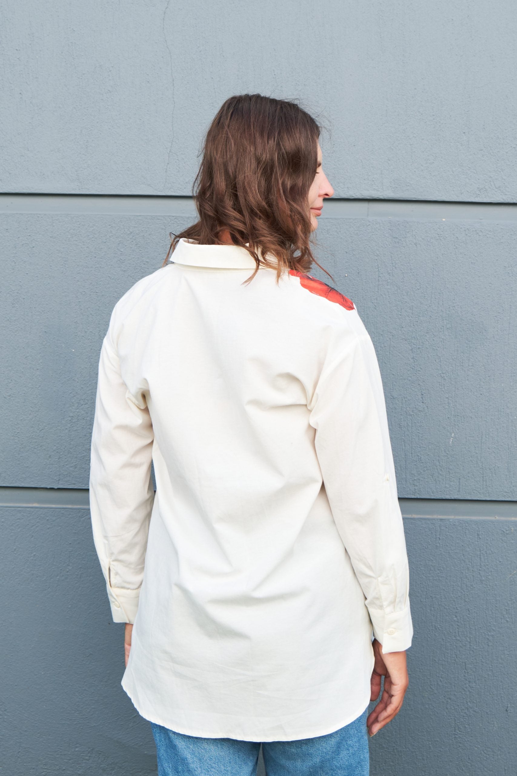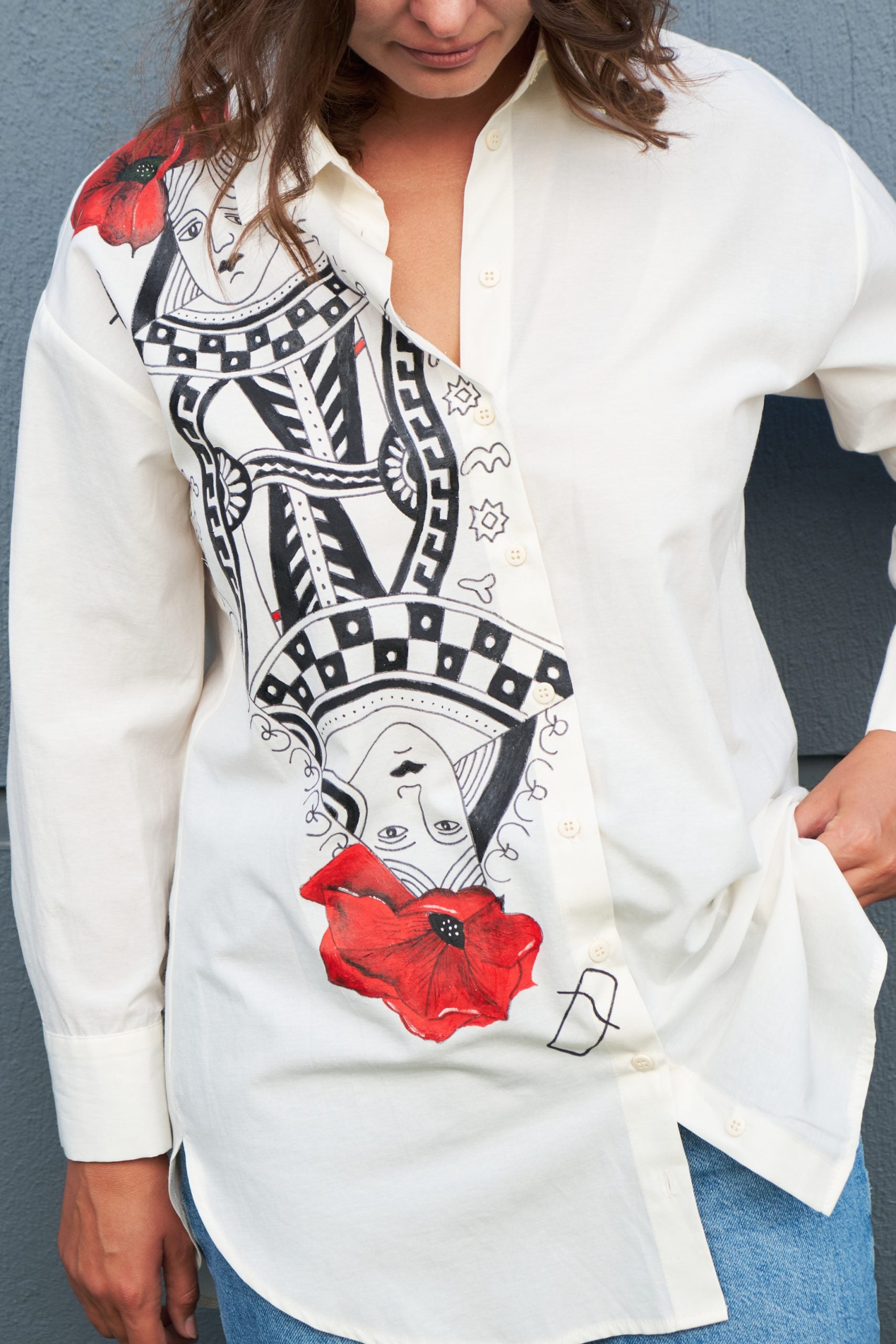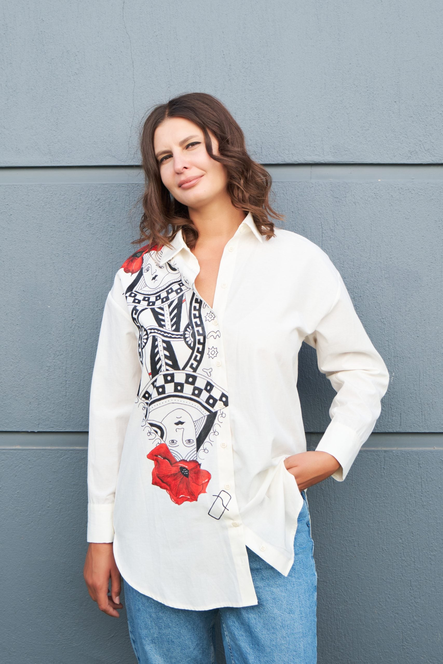 Bol kesim el çizimi kırık beyaz gömlek. Önü düğmeli, yumuşak Poplin kumaştan üretilmiştir. El çizimi olan bu gömleklerimiz her biri tamamen eşsiz ve sınırlı sayıda üretilmiştir. Dilediğiniz gibi kombinleyebilir, özellikle yaz ve geçiş aylarında gardırobunuzun bir star parçası olacaktır.
