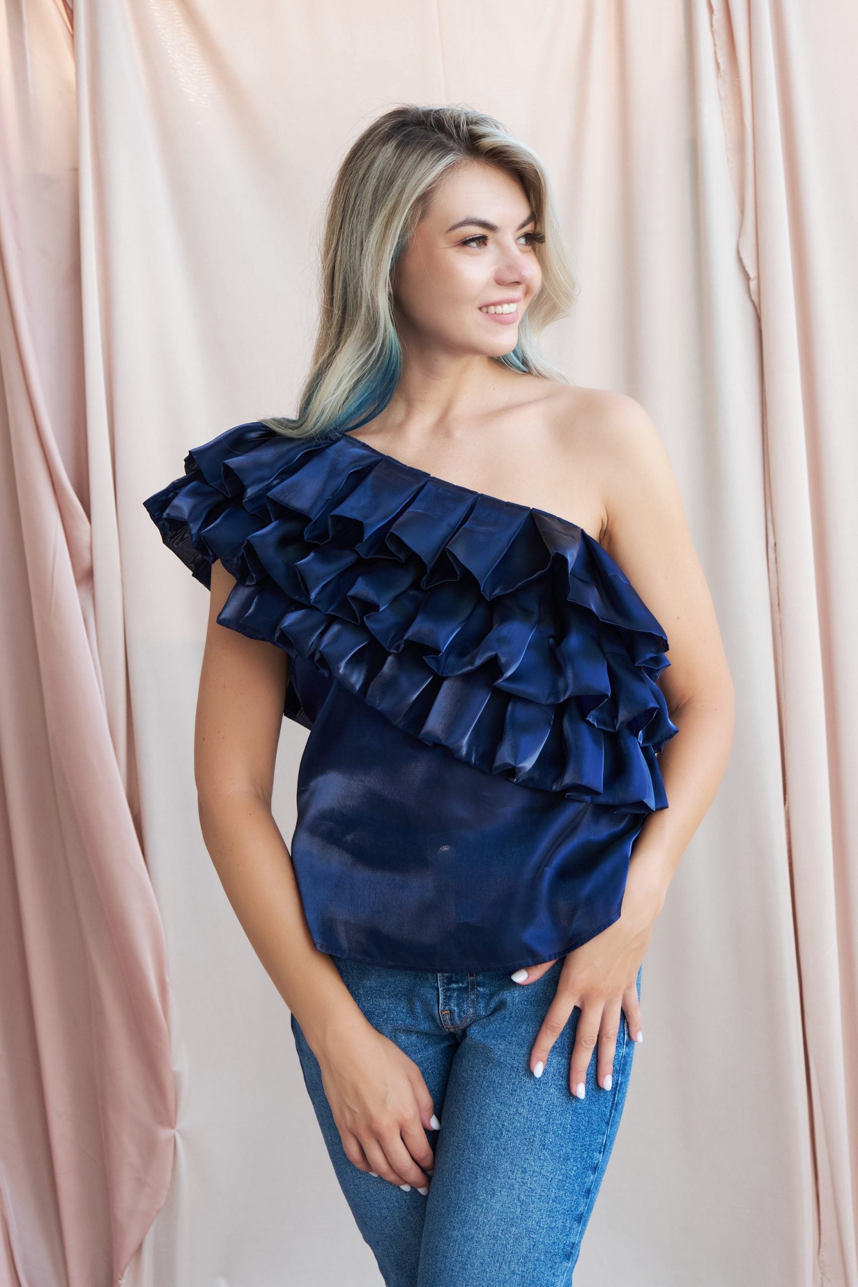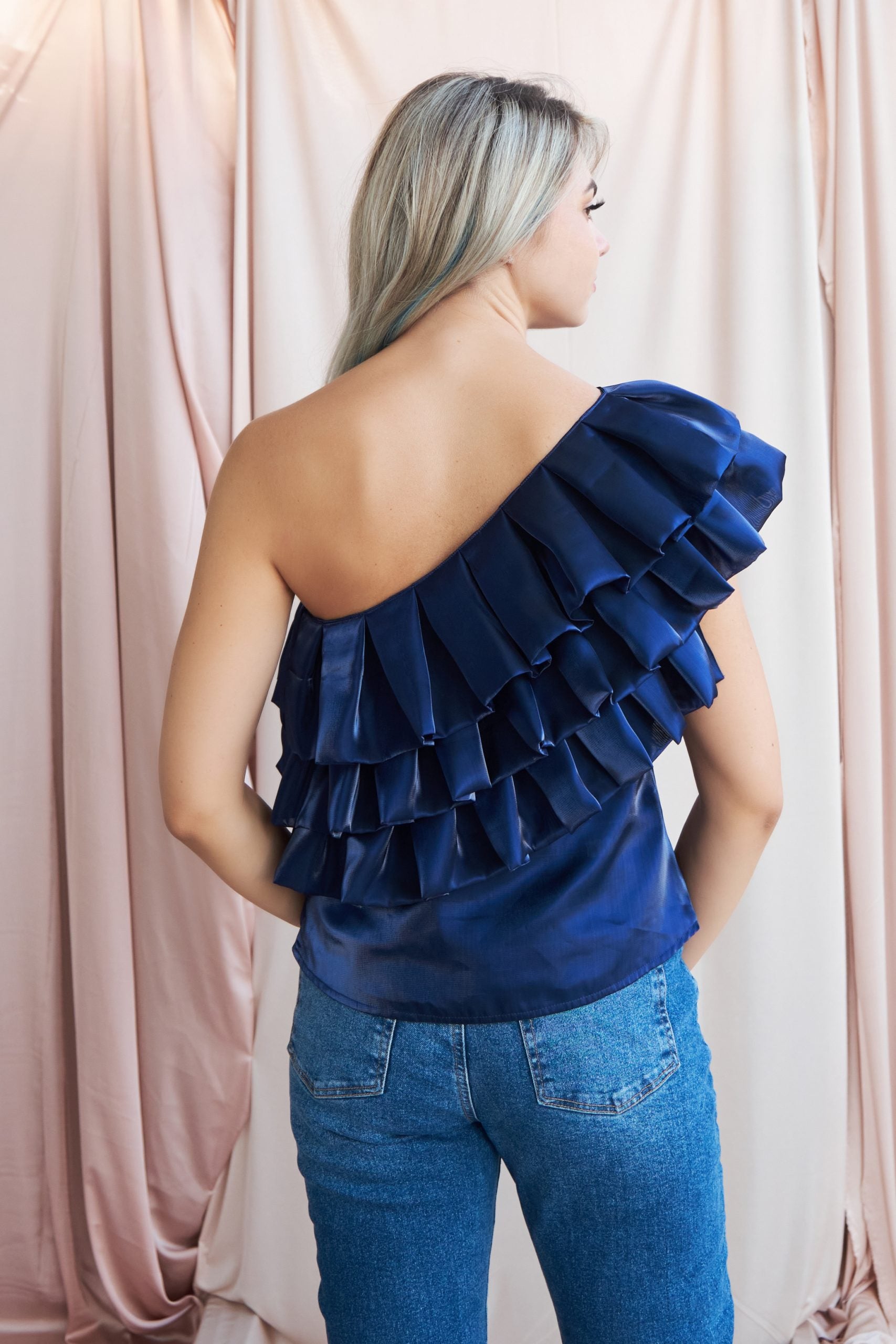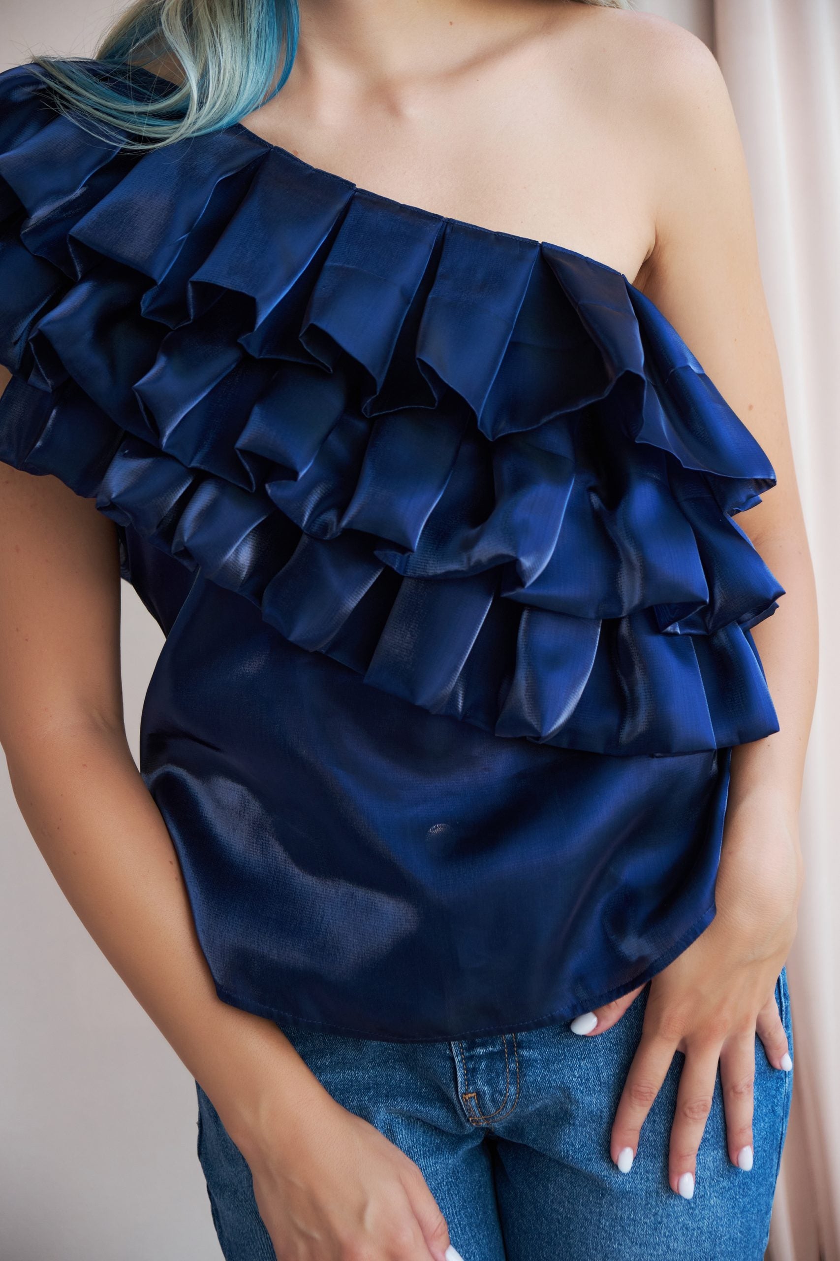 Lacivert Tek Omuzlu Fırfırlı Blüz