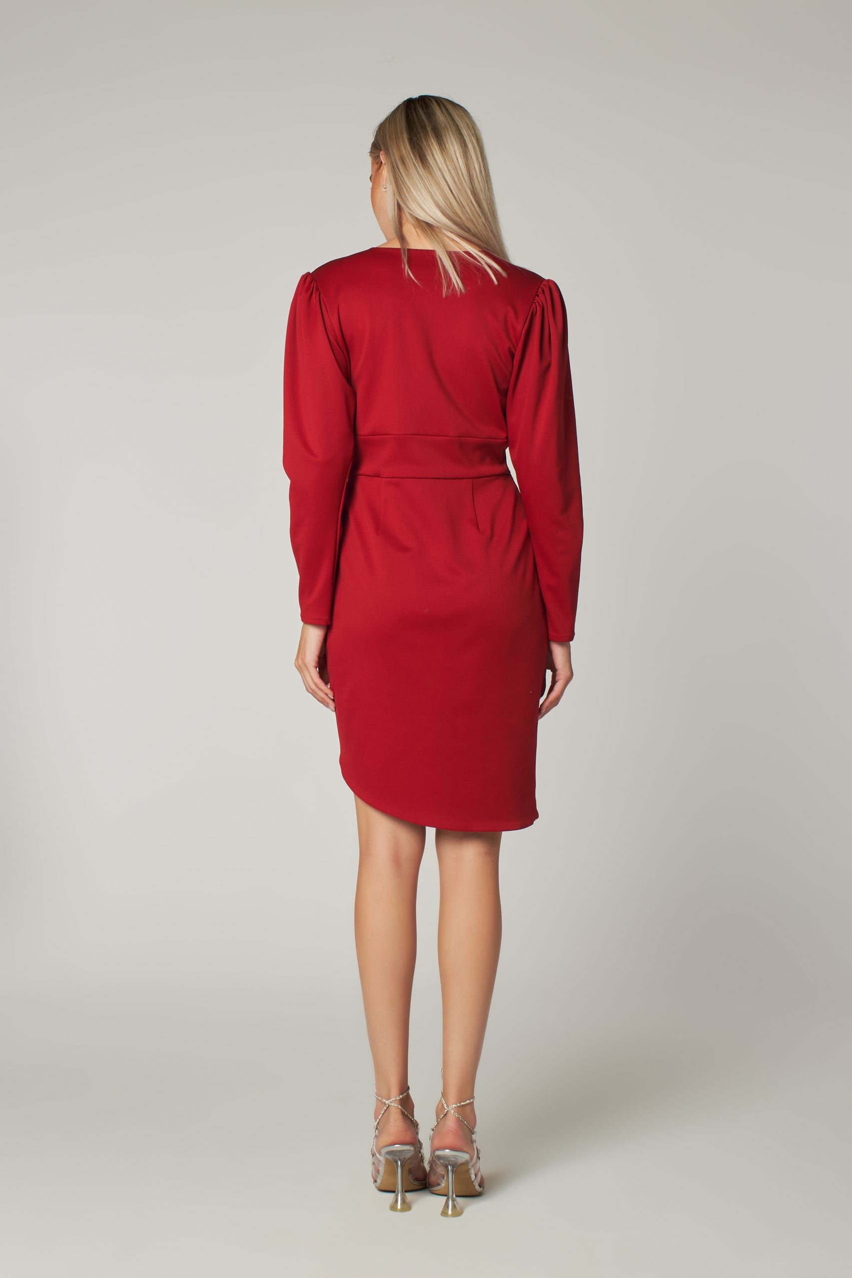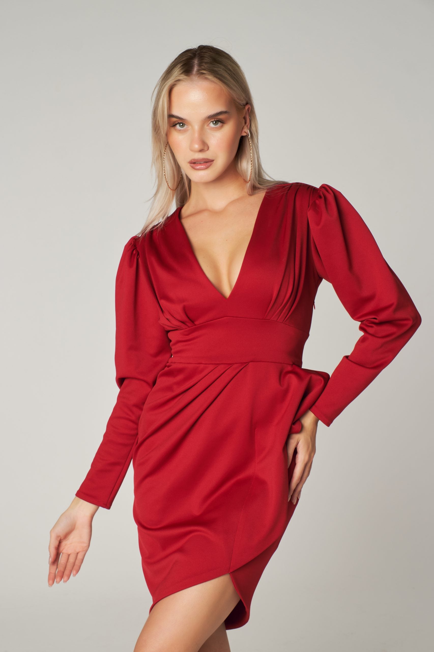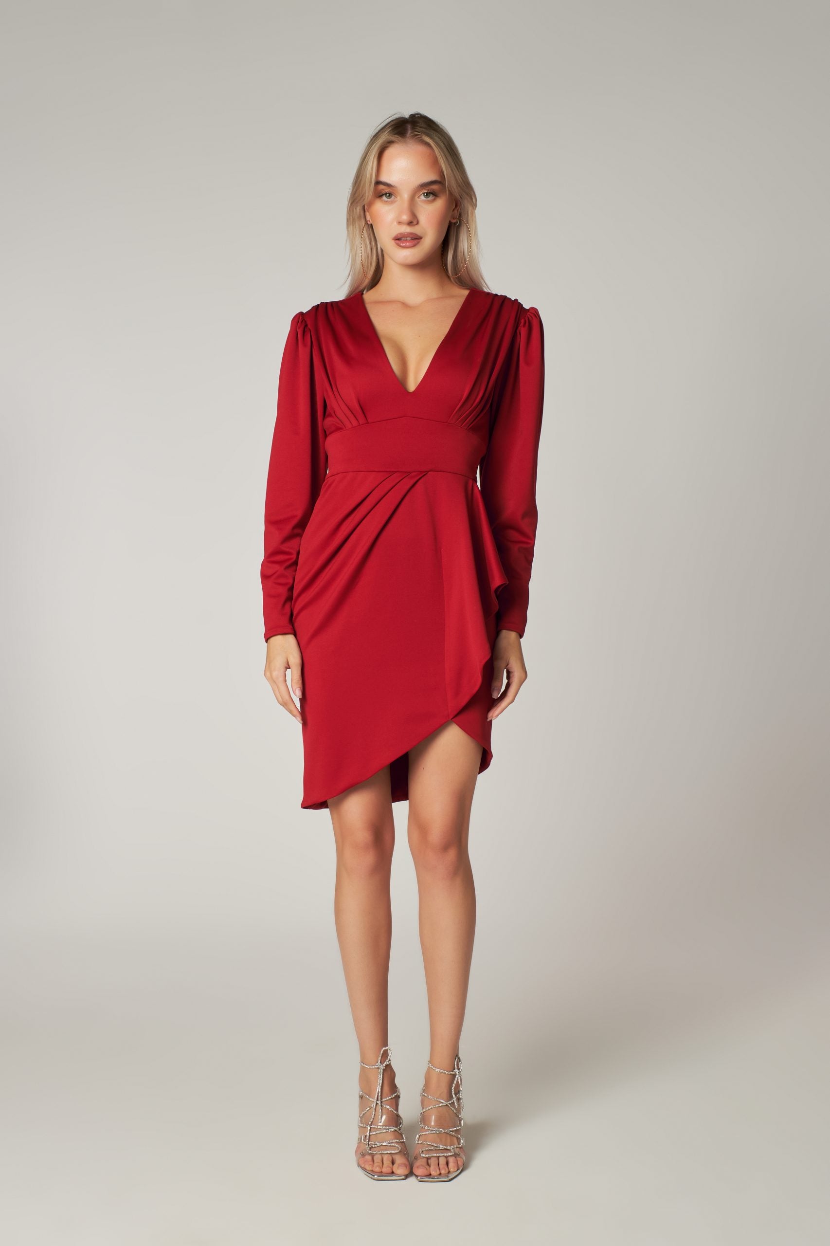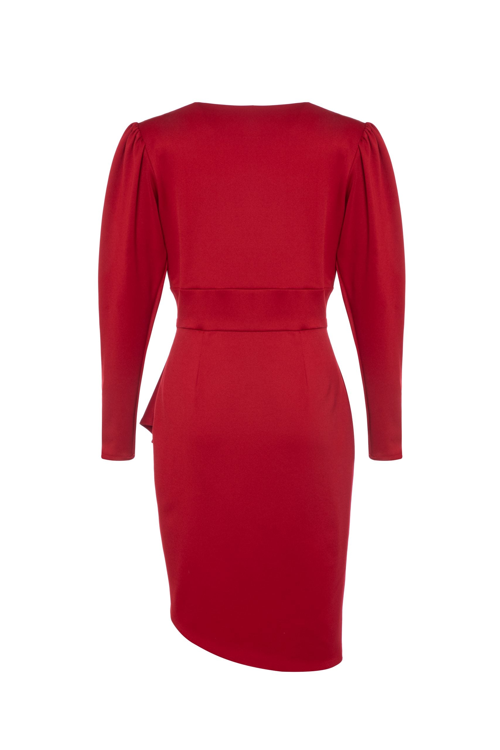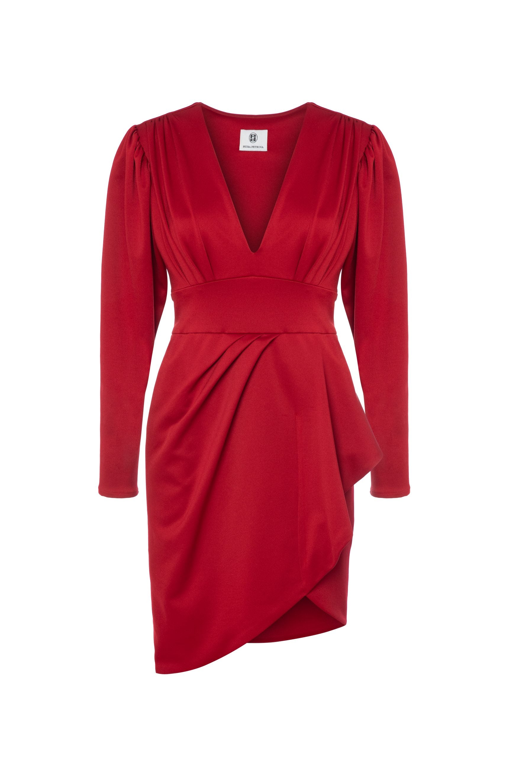 Hacimli kolları yanı sıra, Göğüs uzerindeki ince drapeler ,eteğin üzerindeki  asimetrik drapeler ile tamamlanan bu elbise kombininizin asla sıkıcı olmamasını sağlayacaktır . V yaka detayı eteğin ön kısmındaki asimetrik kesimi de dengelemektedir . Elbisenin  tamamı yarı likralı ve astarlıdır . Bu elbise, özel davetlerde zarafetinizi ön plana çıkaracak şık bir seçim.