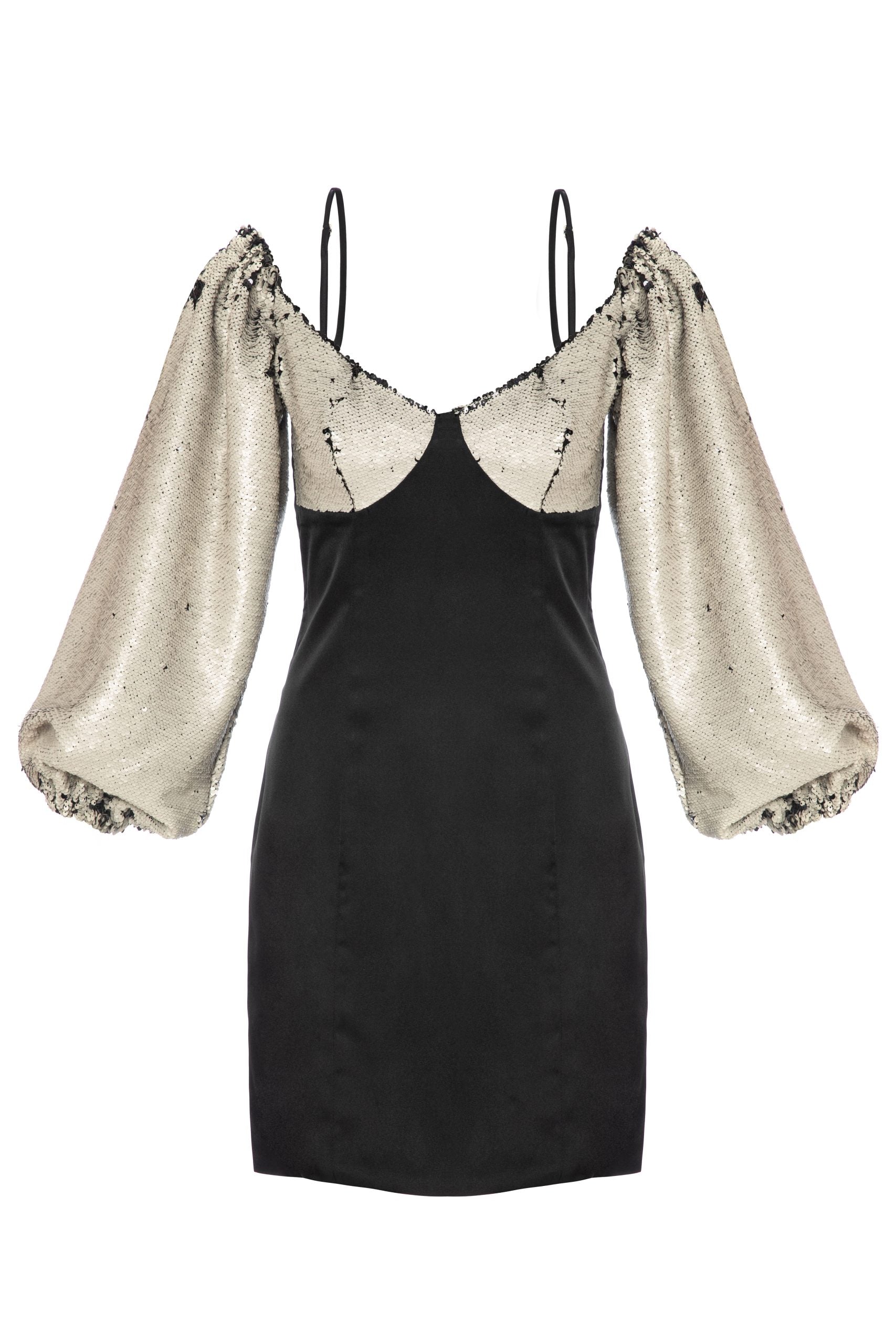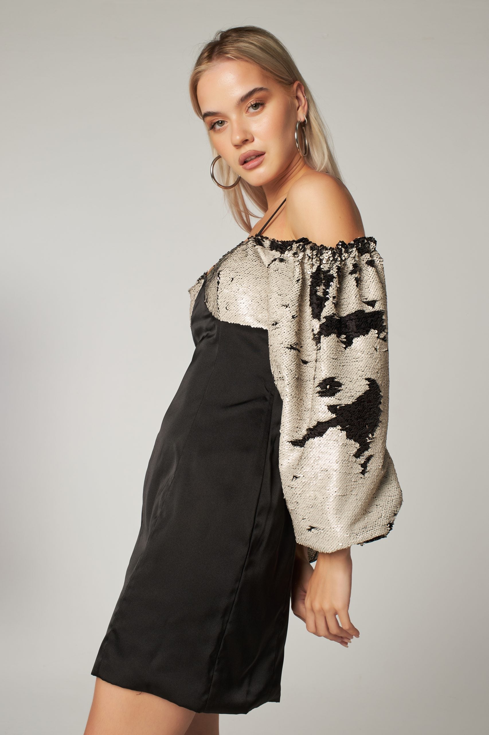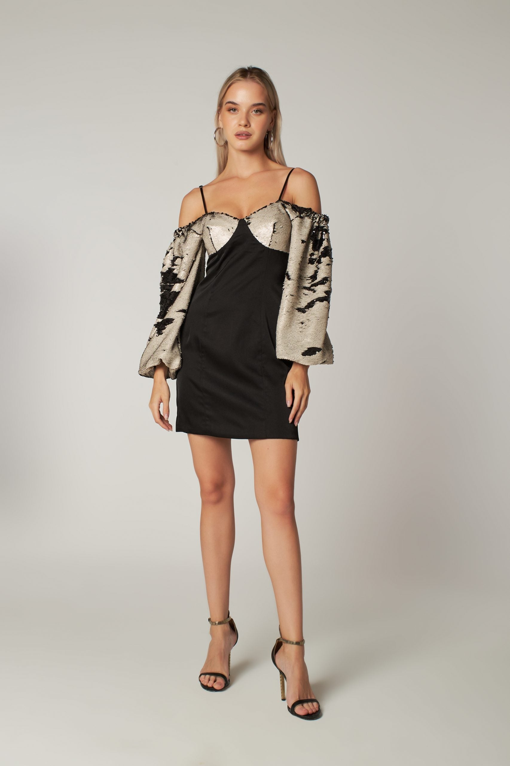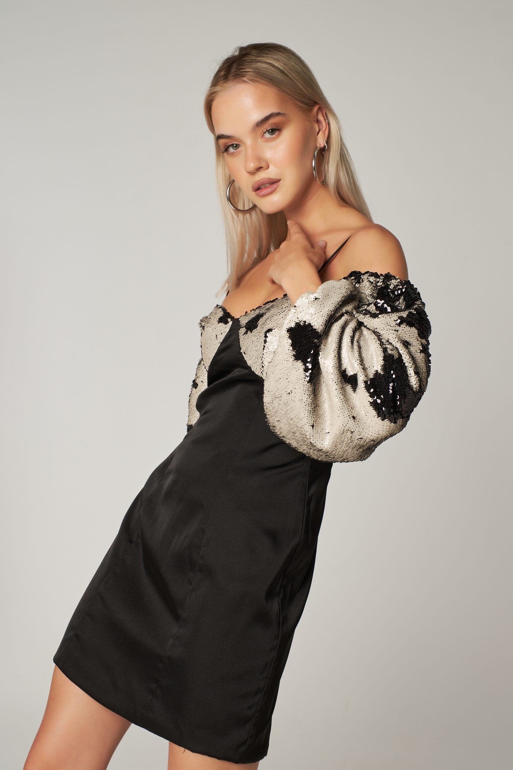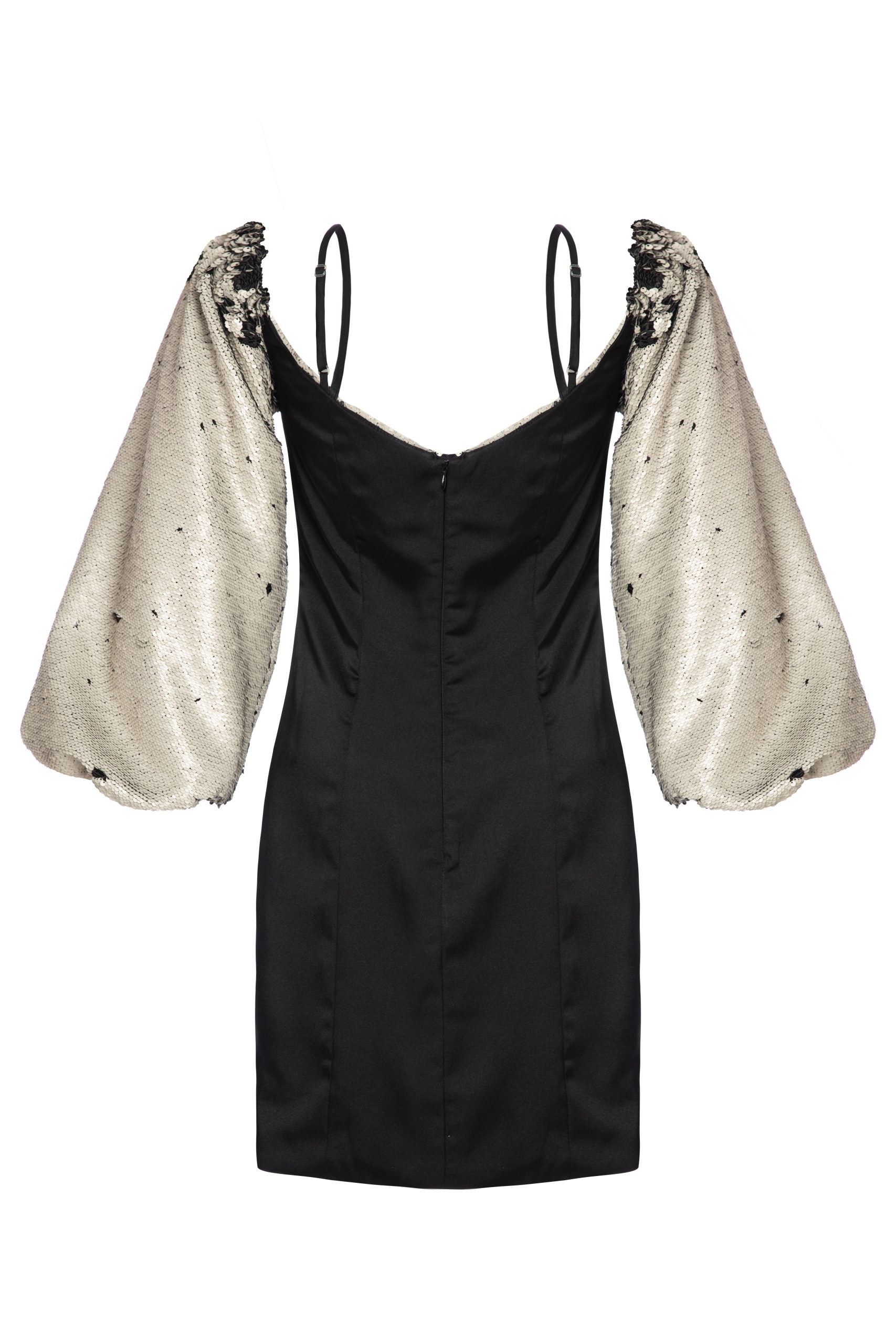 Siyah Payetli Düşük Omuzlu Elbise TİNA