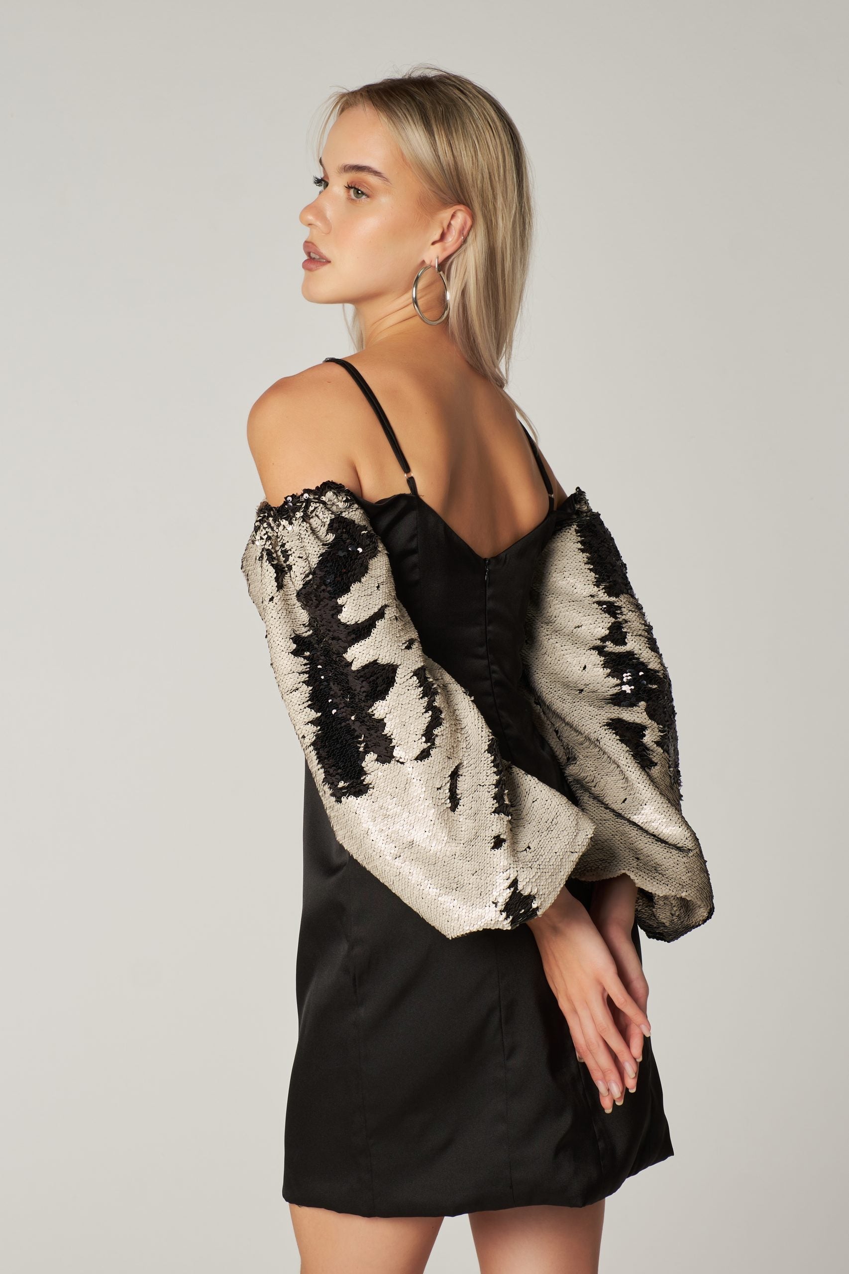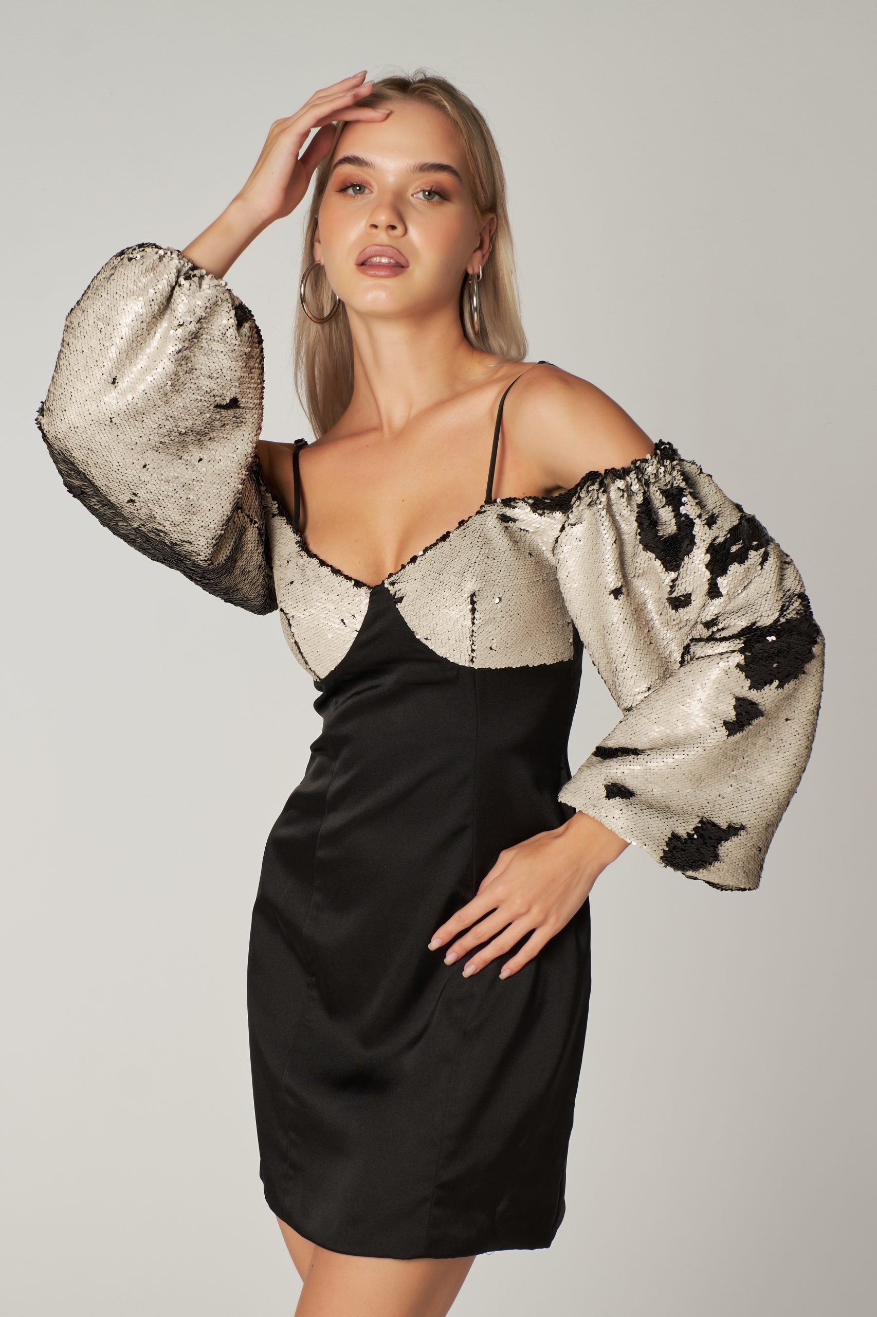 Düşük omuzlu , Siyah -beyaz geçişli pul detaylı geniş kollu , omuzlarında da ince ayarlanalabilen askılı rahat kesim yarı-likralı saten kumaştan üretilmiş mini elbise . İthal kumaş özel baskı siyah kumaşı çabasız şıklığı bu elbise ile yakalayın .Belde fit oturur . Kolda Tende Pulların tahrişini önlemek için transparan astar kullanılmıştır . Bu parça, girdiğiniz her ortamda ışıldamanız için tasarlandı.