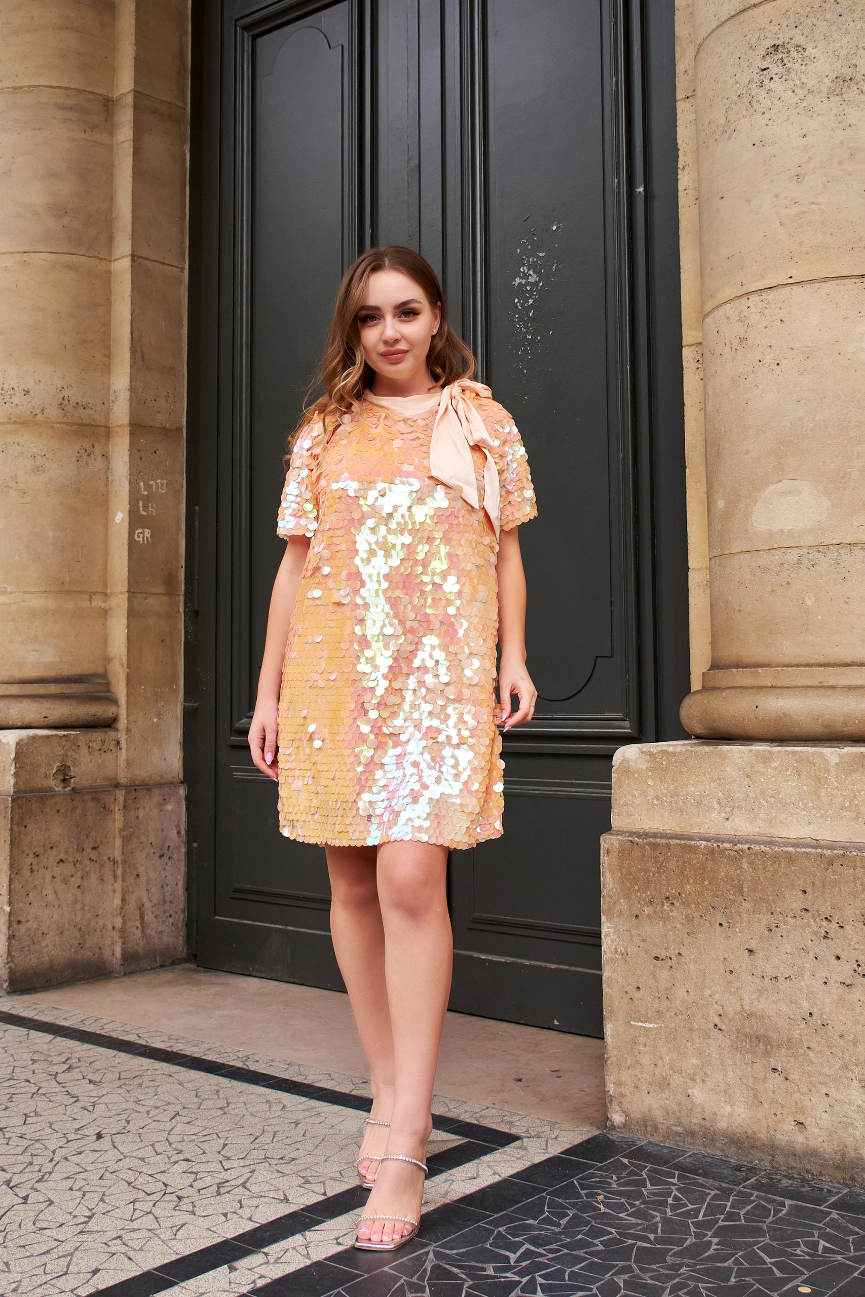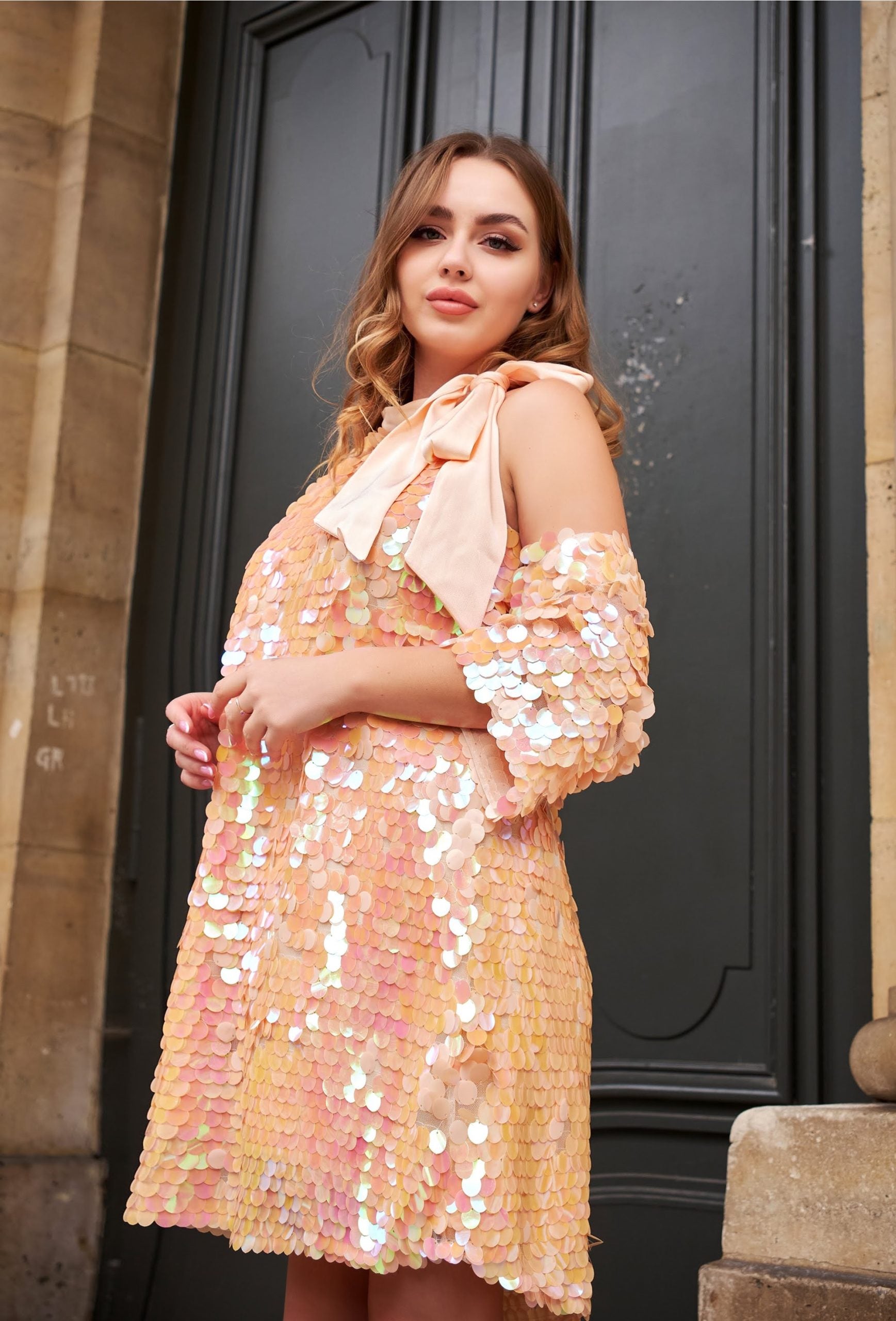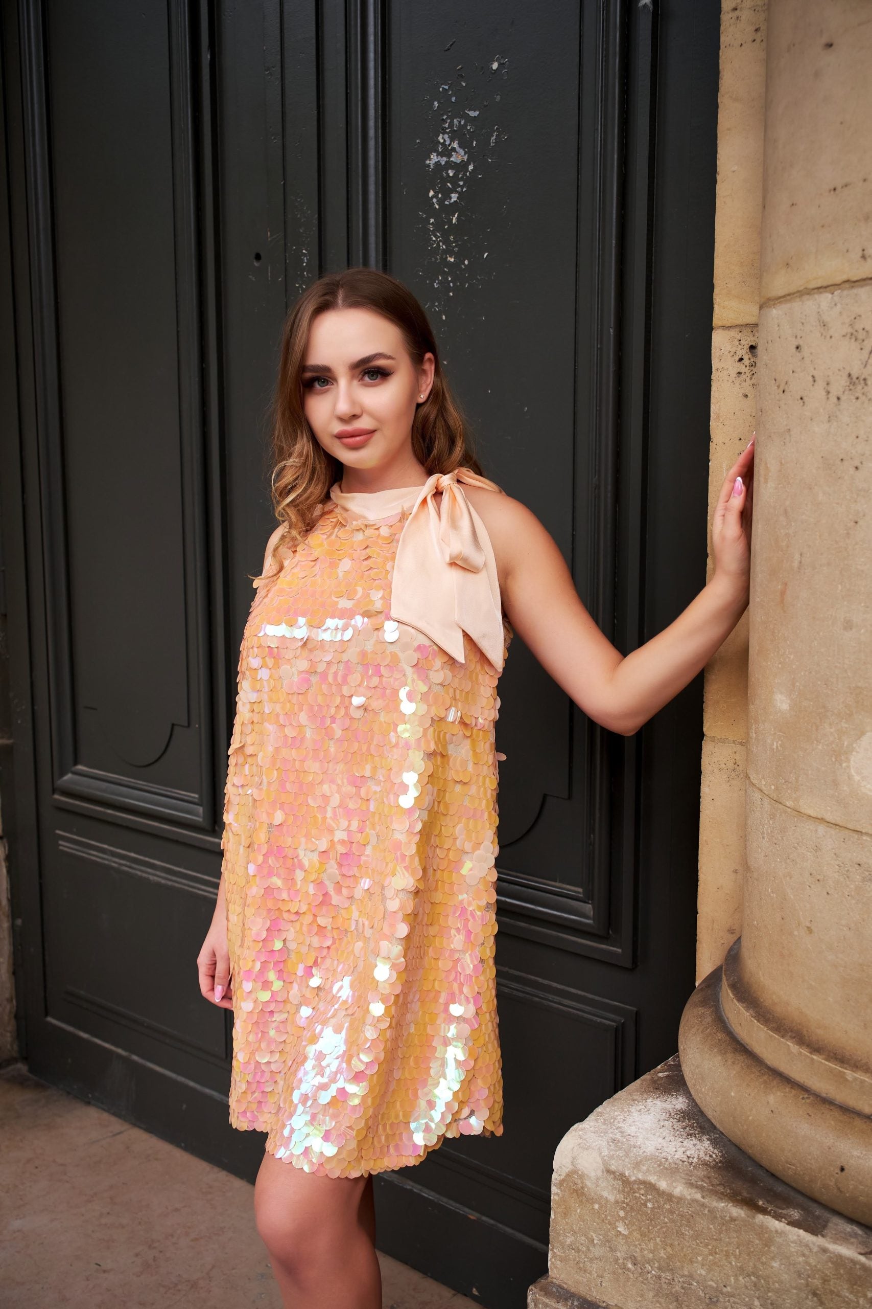 Rahat A- kesim tasarımı siluetiyle, göz alıcı şeftali hologram payetlerle süslenmiş cesur ve gösterişli bir görünüm sunar. Boyundan kurdele ile bağlanması ,mini boy eteği ve bolerosu ile akşam davetleri ve özel günler için mükemmeldir. Bu elbise, rahatlığı ve gösterişli ışıltıyı bir araya getirerek, unutulmaz bir gece için dikkat çekici bir tasarım sunar.
