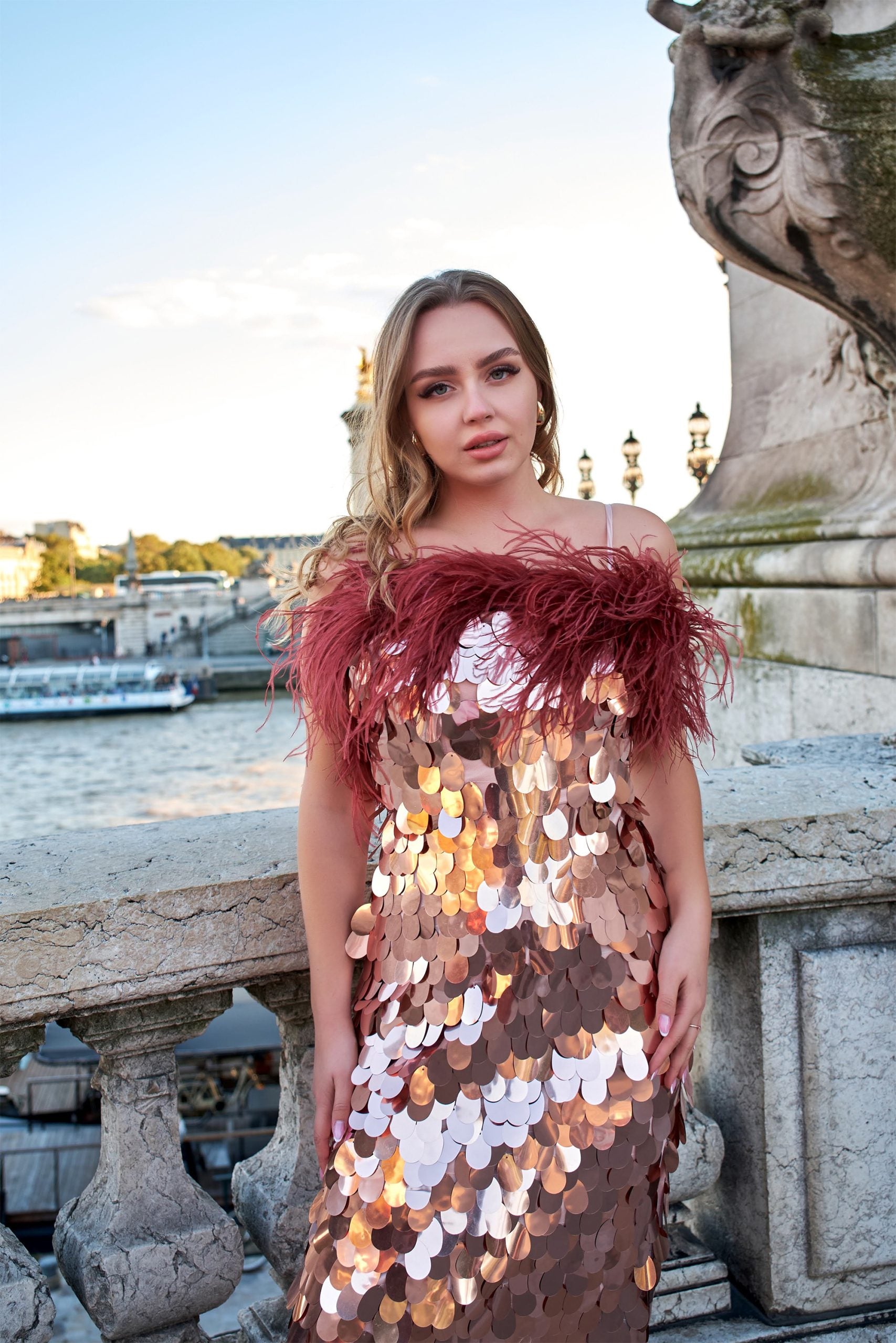 Cesur olun ve Işıltıyı üzerinizde hissetmeye hazır olun! Vücuda kusursuzca oturan kalıbı, feminen siluetinizi ön plana çıkarırken, büstiyer kısmındaki gizli düğmeli çıkarılabilir boa otriş detayıyla iki farklı stil yaratmanıza olanak tanır. İster sofistike bir sadelik, ister etkileyici bir gösteriş… Seçim tamamen size ait!