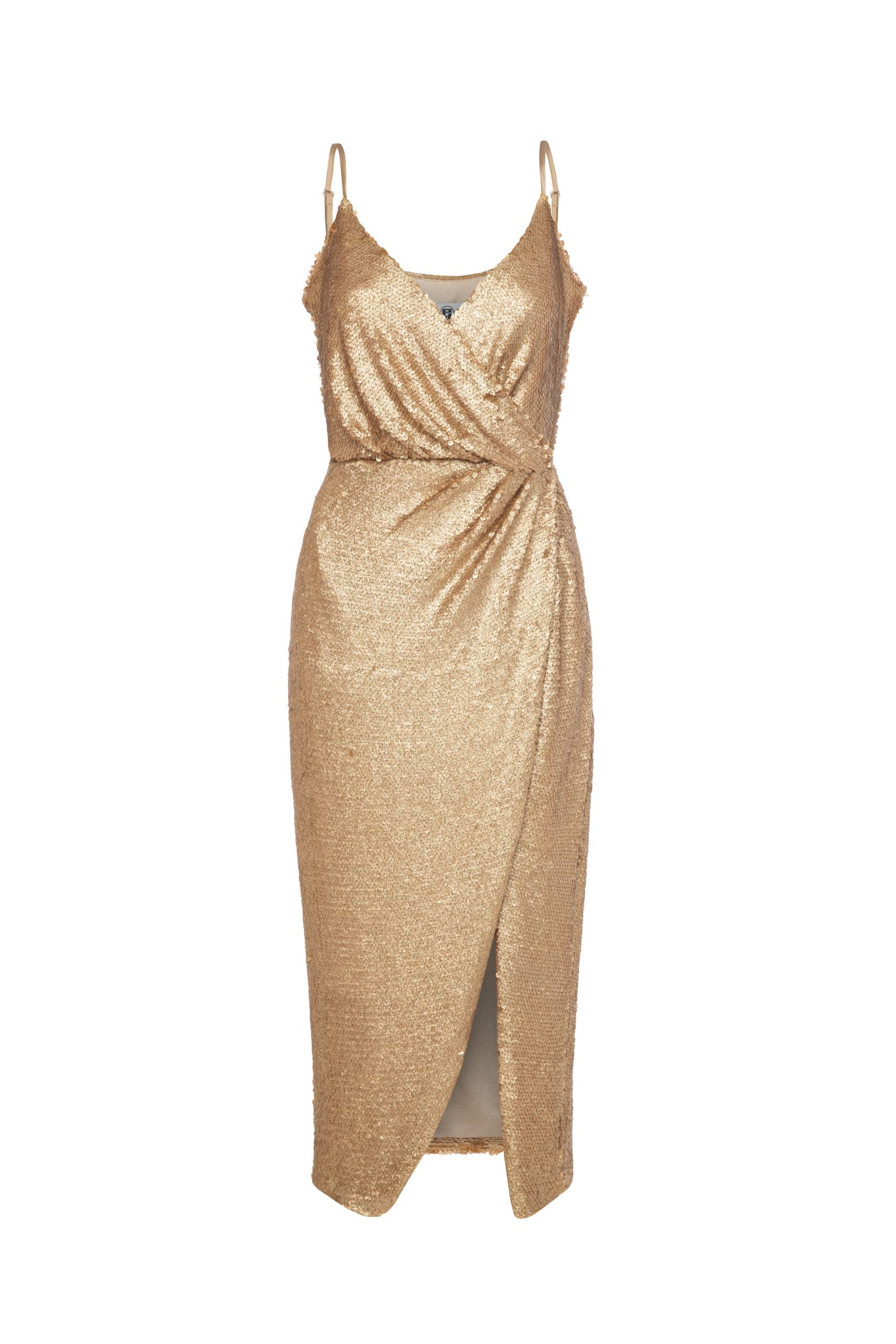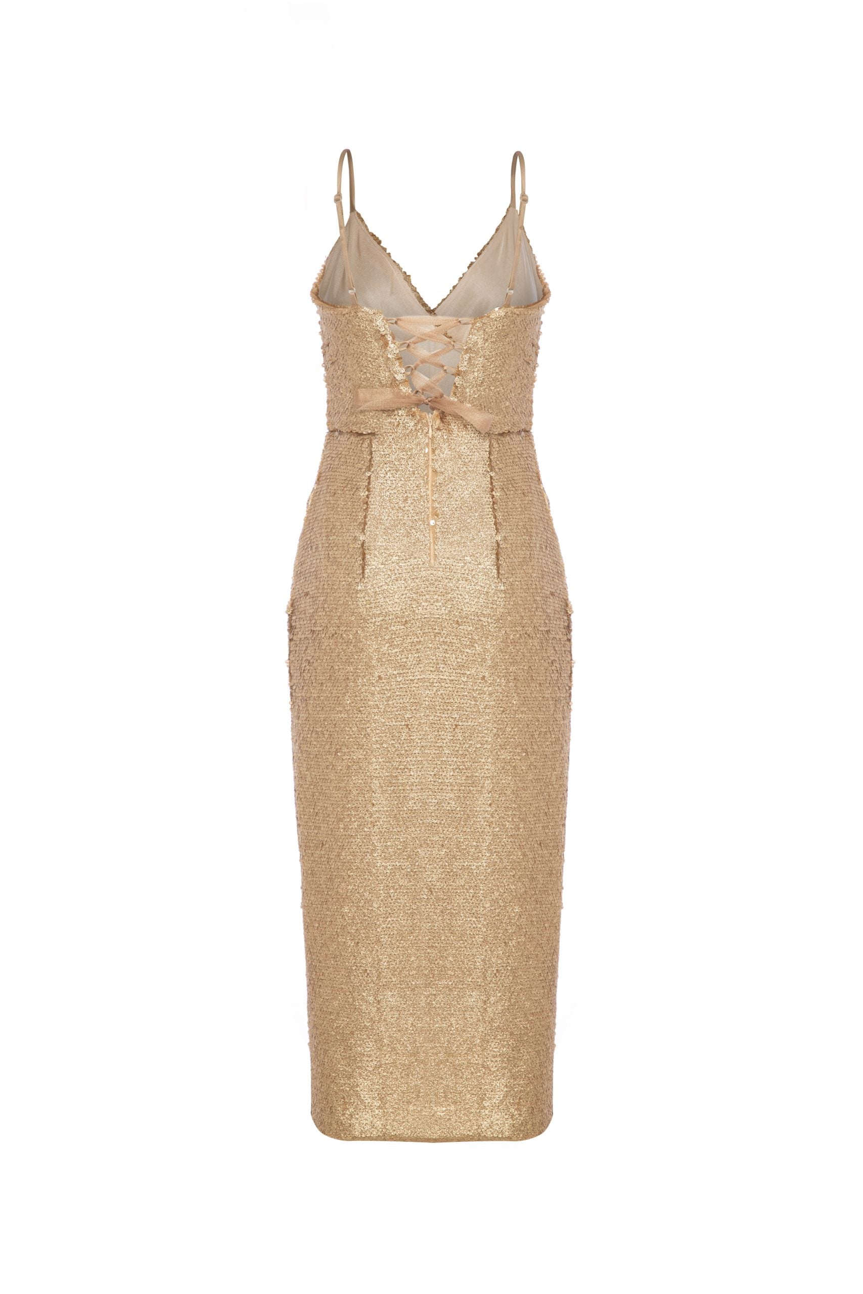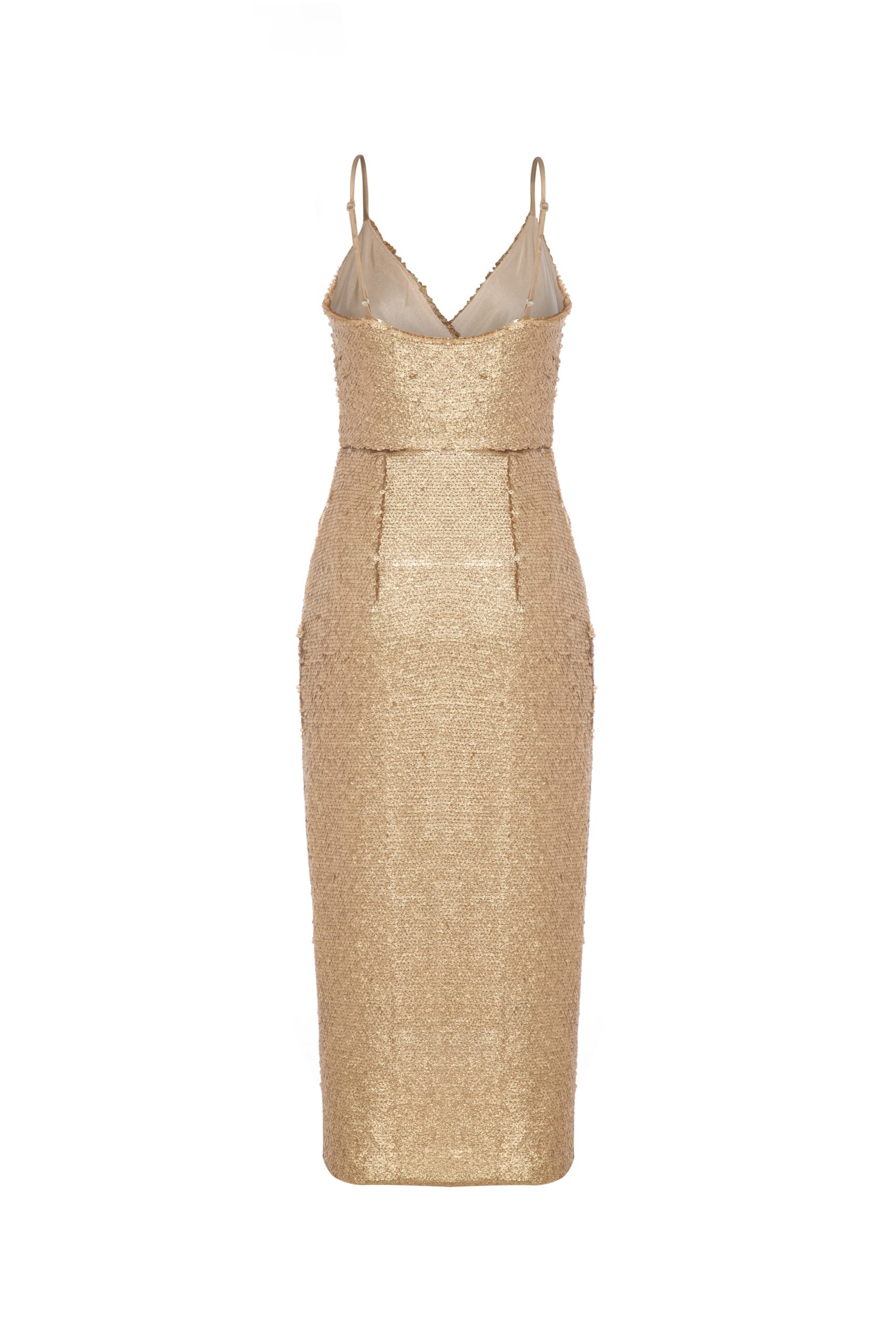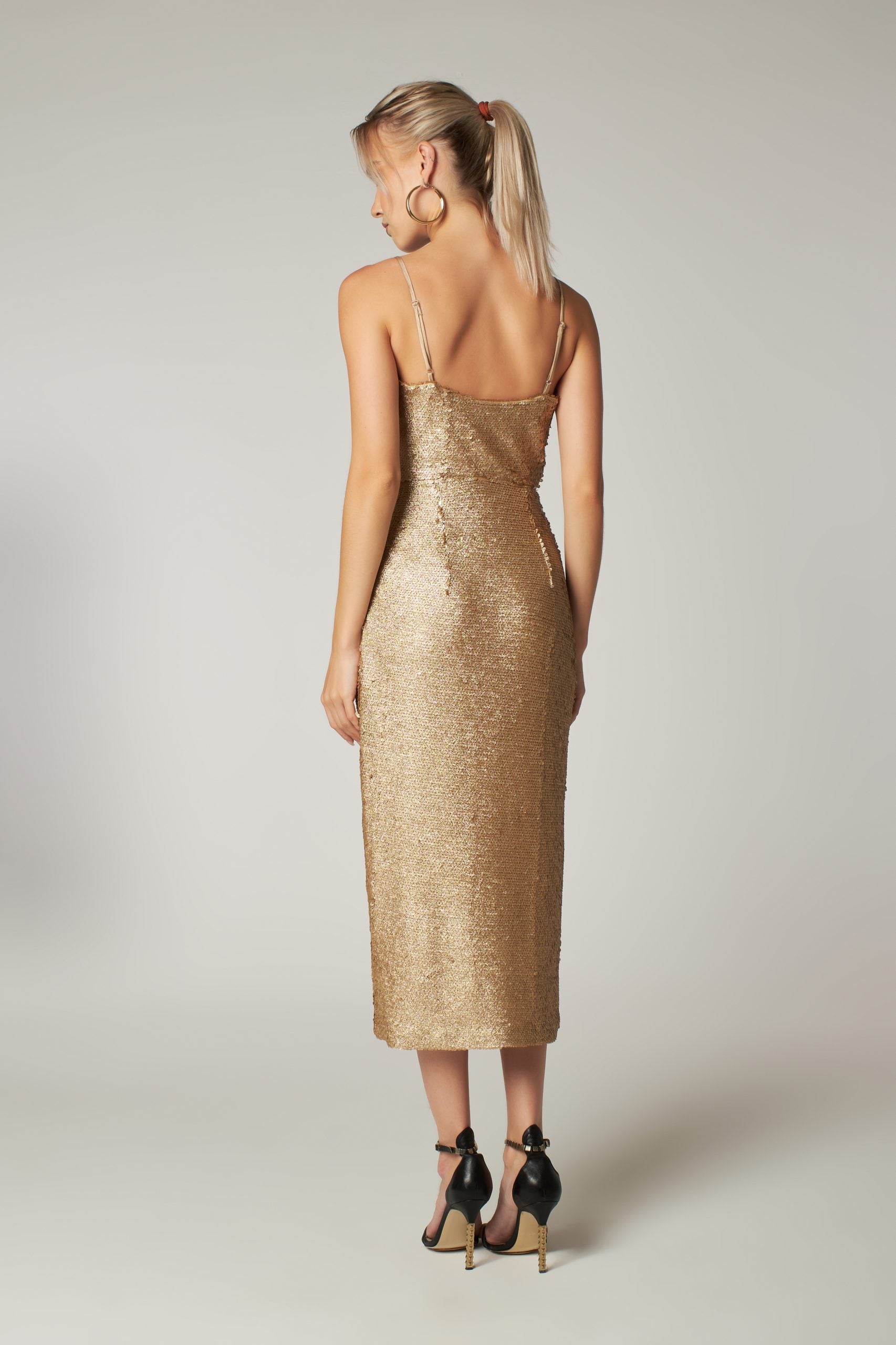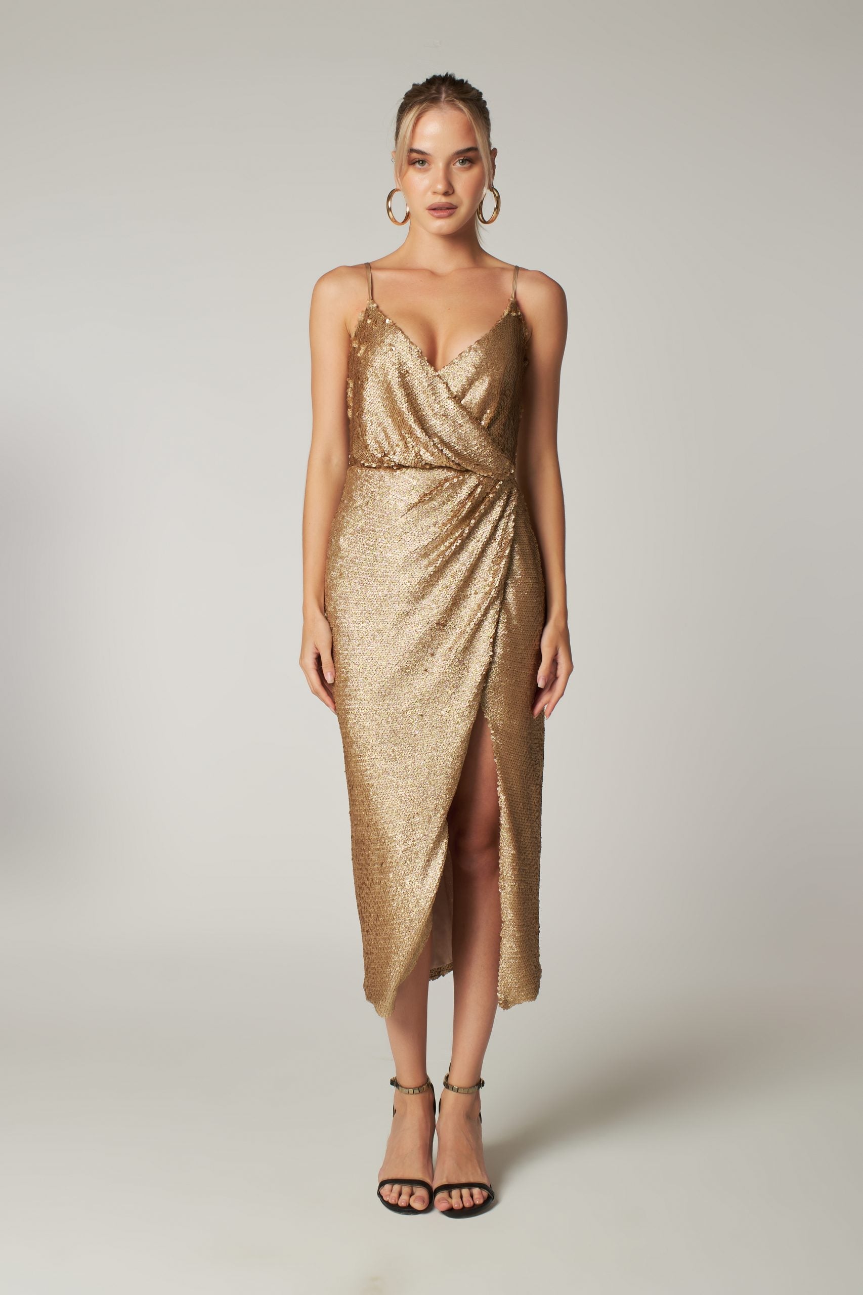 Işıltısıyla büyüleyen, premium kalite ithal kumaştan üretilmiş bu altın payetli elbise; özel geceler ve unutulmaz anlar için tasarlandı. Fit kalıbı ve yarı likralı yapısıyla vücudu zarifçe sararken, asimetrik ve anvelop kesimiyle modern bir siluet sunar. Astarlı yapısı sayesinde hem konfor hem de şıklık bir arada sunulurken, her adımda ışığı yansıtan payet detayıyla iddialı bir görünüm yaratır. Davetlerde  ya da özel kutlamalarda stilinizi zirveye taşıyacak etkileyici bir elbise .