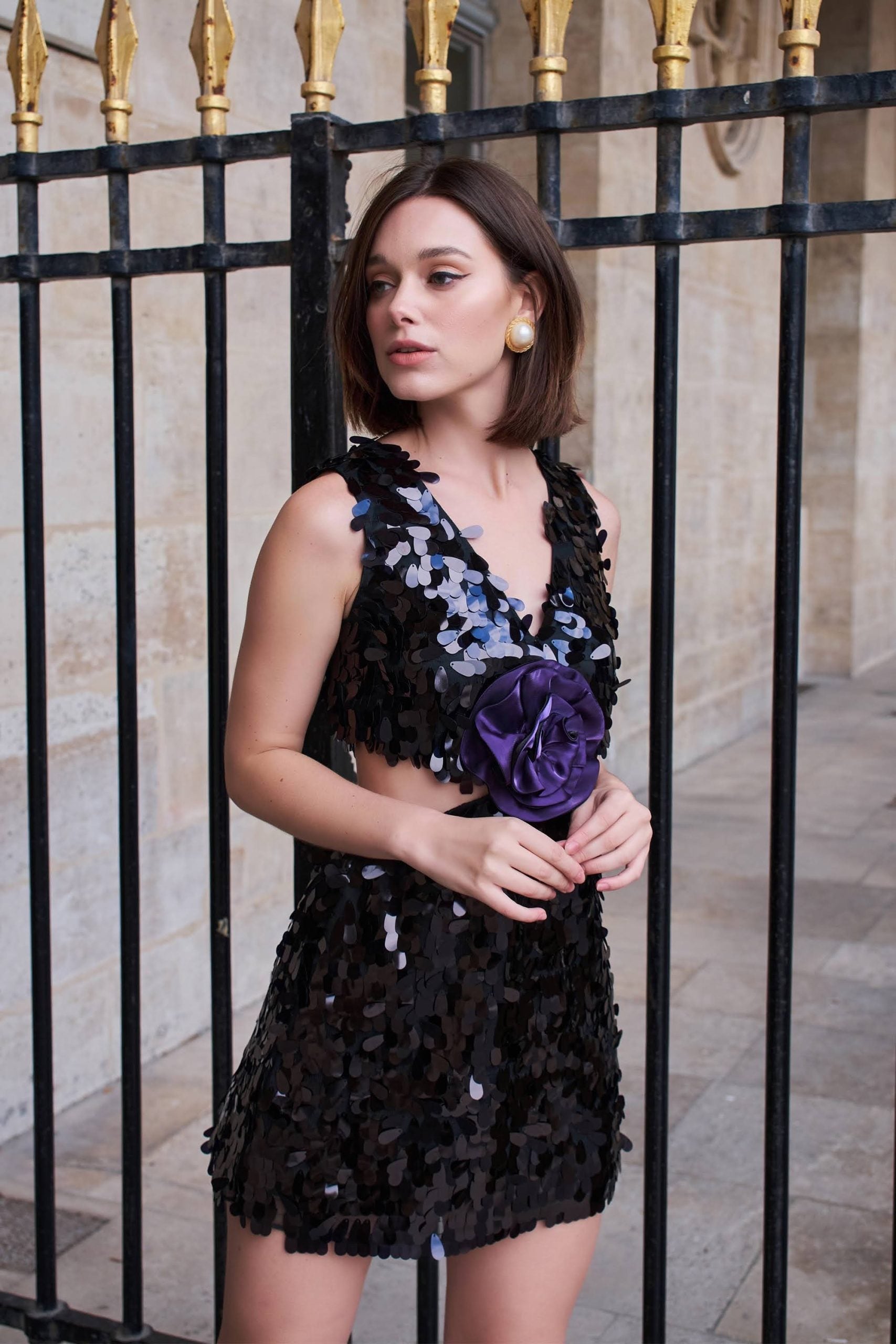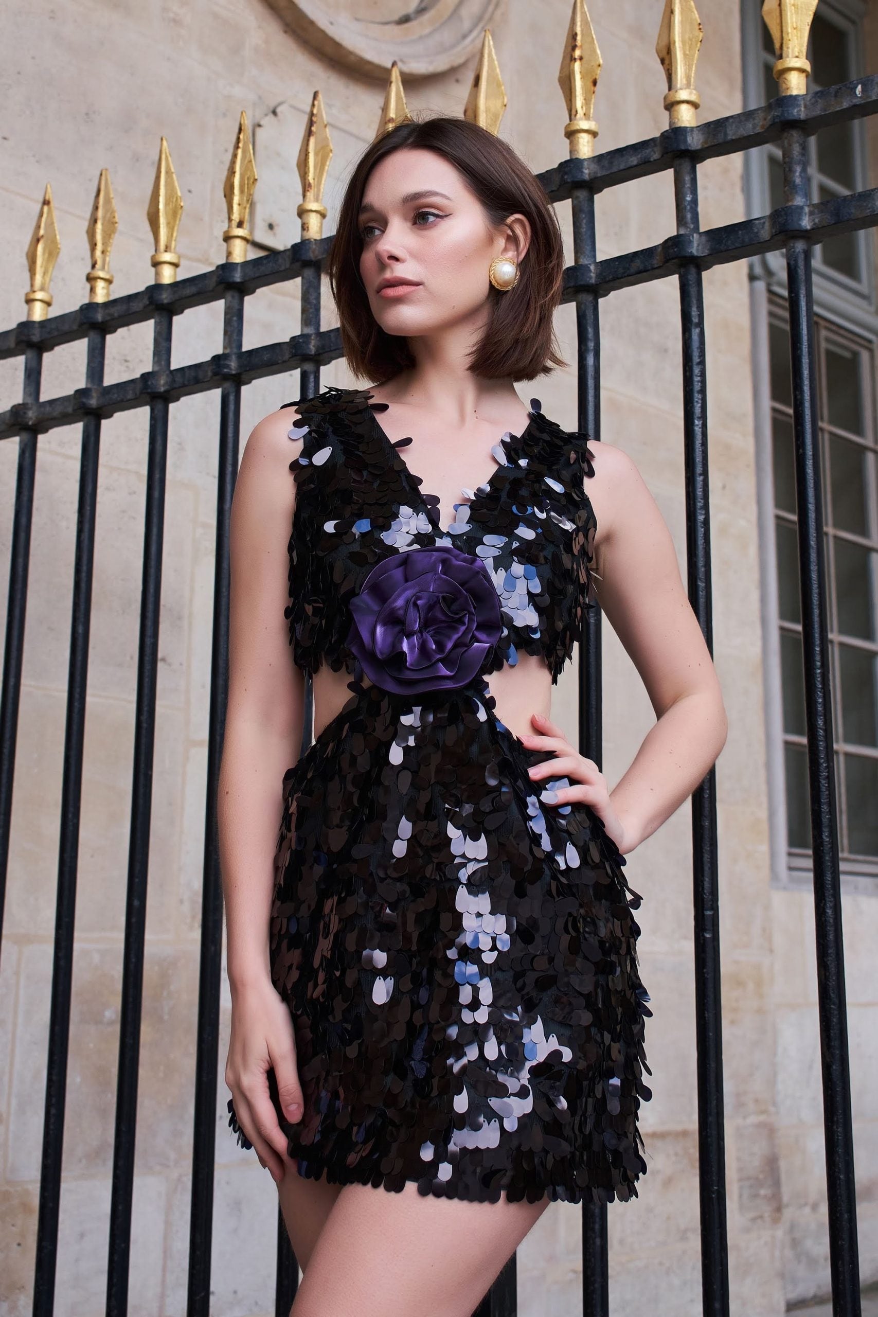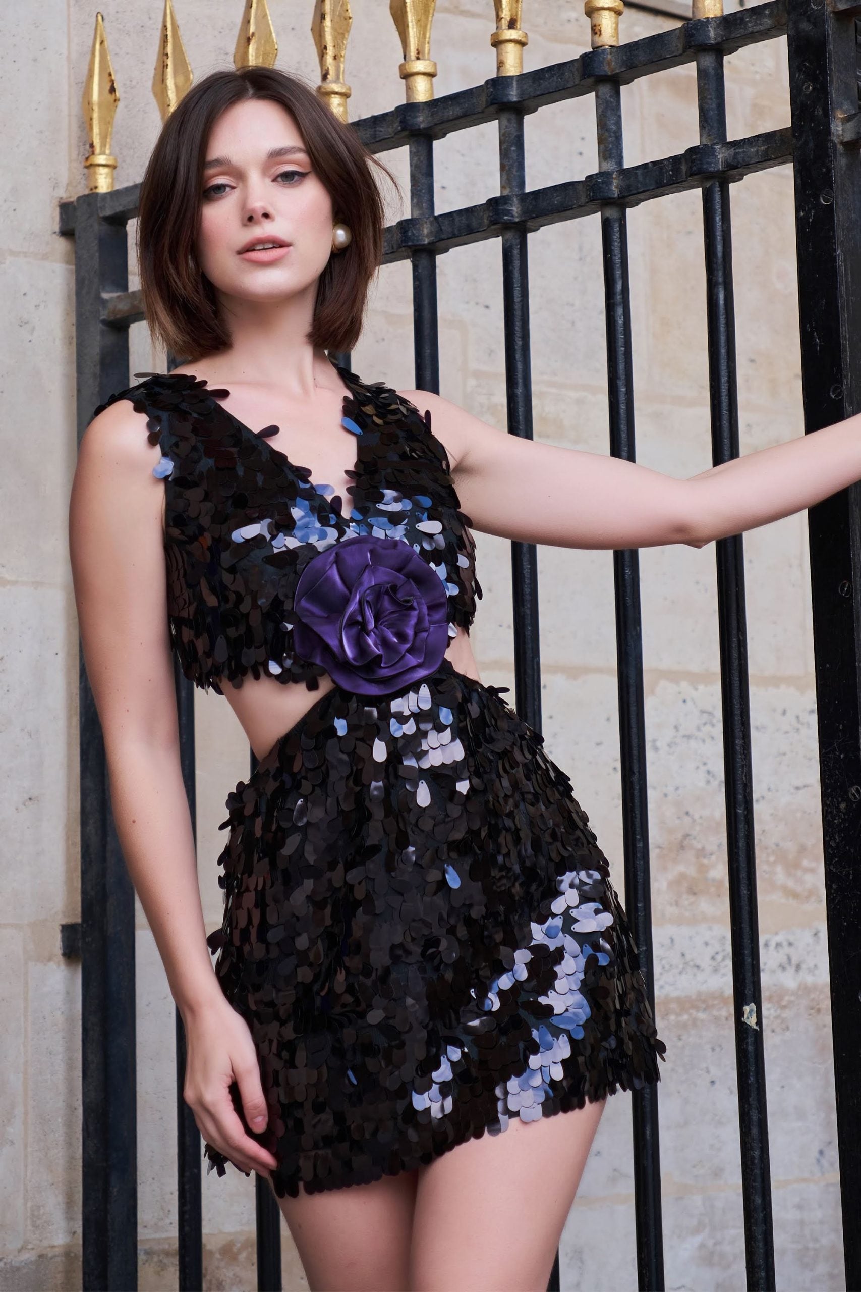 Siyah payet zarafettir .Elbisenin yanlarında ve arkasında yer alan kesimler çarpıcı , oldukça ince bir siluet görüntüsü oluşturuyor . Ayrıca Üst ve Alt kısımda eklenen içten lastikli olması da elbiseye ayrı konfor sağıyor .Üst ve eteğin birleştiği yerde tasarım gül çiçeği ile süslenmiş rahat A- kesim mini eteği de elbiseye ayrı konfor sağıyor. Bu özel tasarım elbise bu elbise gardrobunuzda her sezona uyum sağlayacaktır.