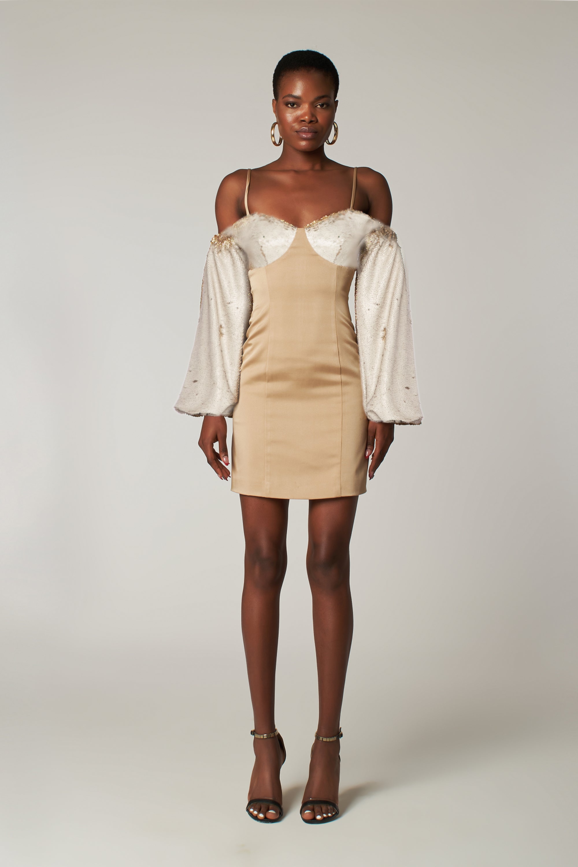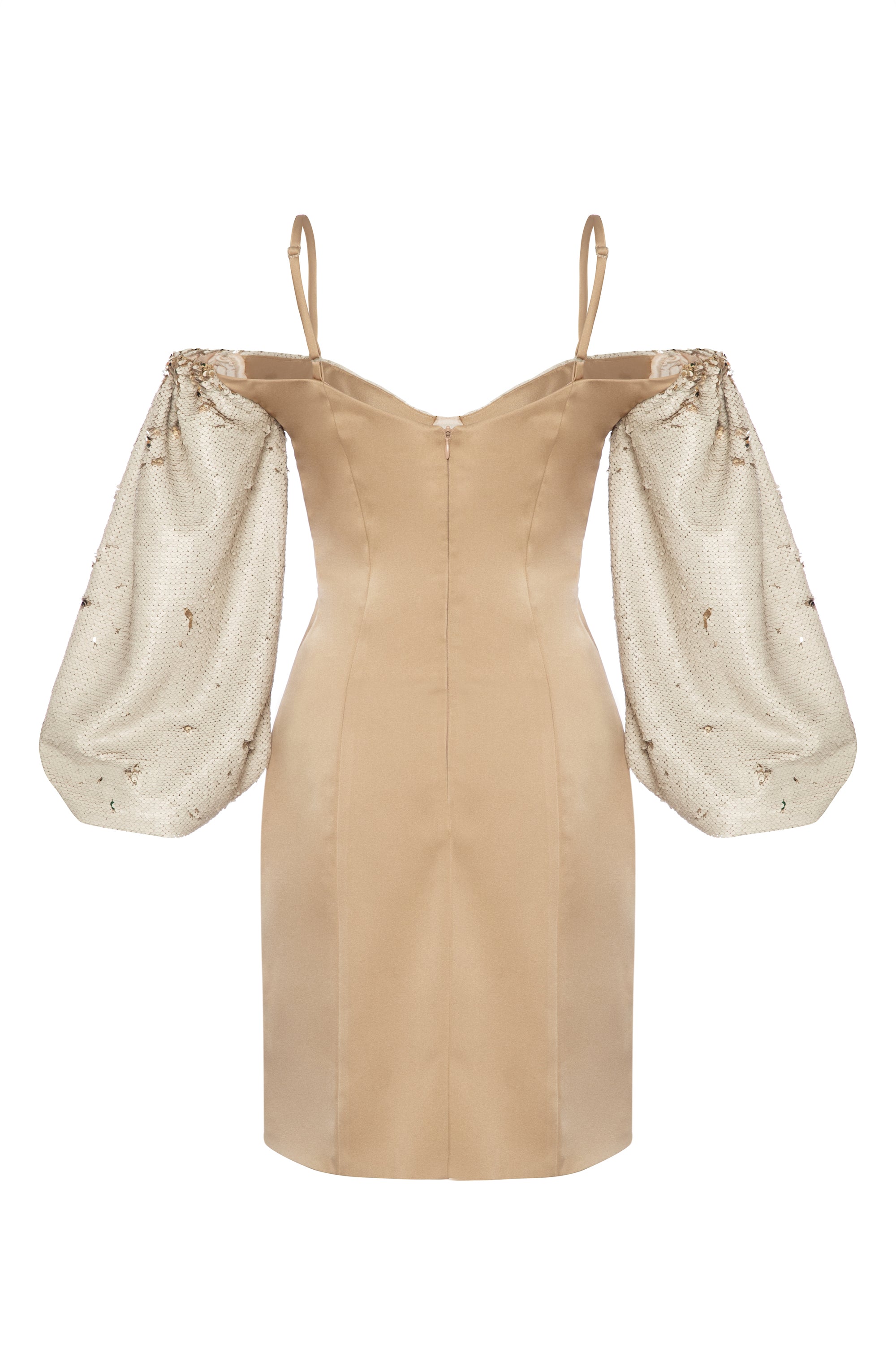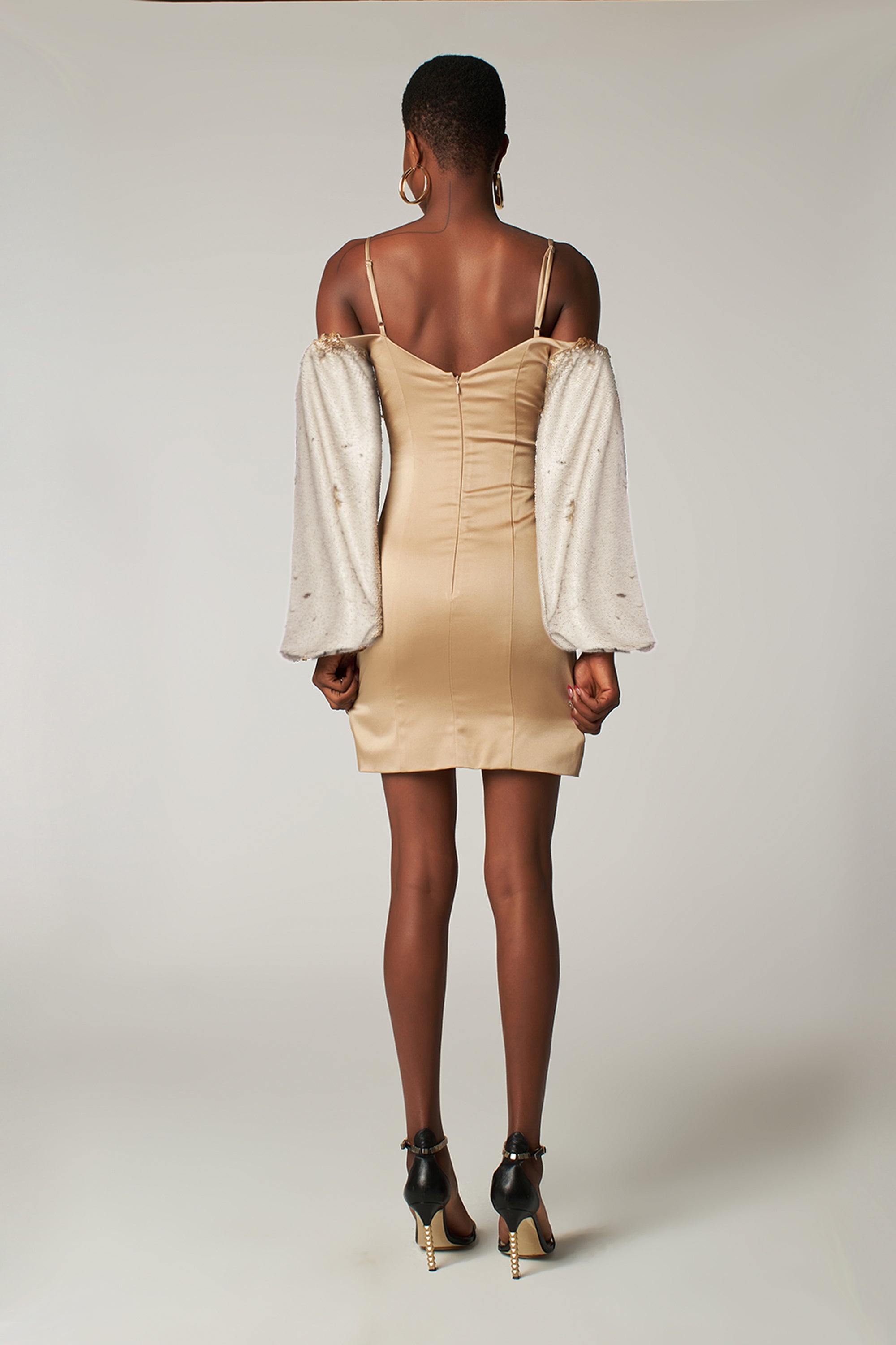 Düşük omuzlu , geniş kol detaylı , omuzlarında da ince ayarlanabilen askılı rahat kesim yarı-likralı saten kumaştan üretilmiş mini elbise . İthal kumaş özel baskı dore şeftali kumaşı çabasız şıklığı  bu elbise ile yakalayın .Belde fit oturur . Kolda  Tende Pulların tahrişini önlemek için transparan astar kullanılmıştır . Romantik akşam yemekleri ve seçkin organizasyonlar için ideal bir tasarım.