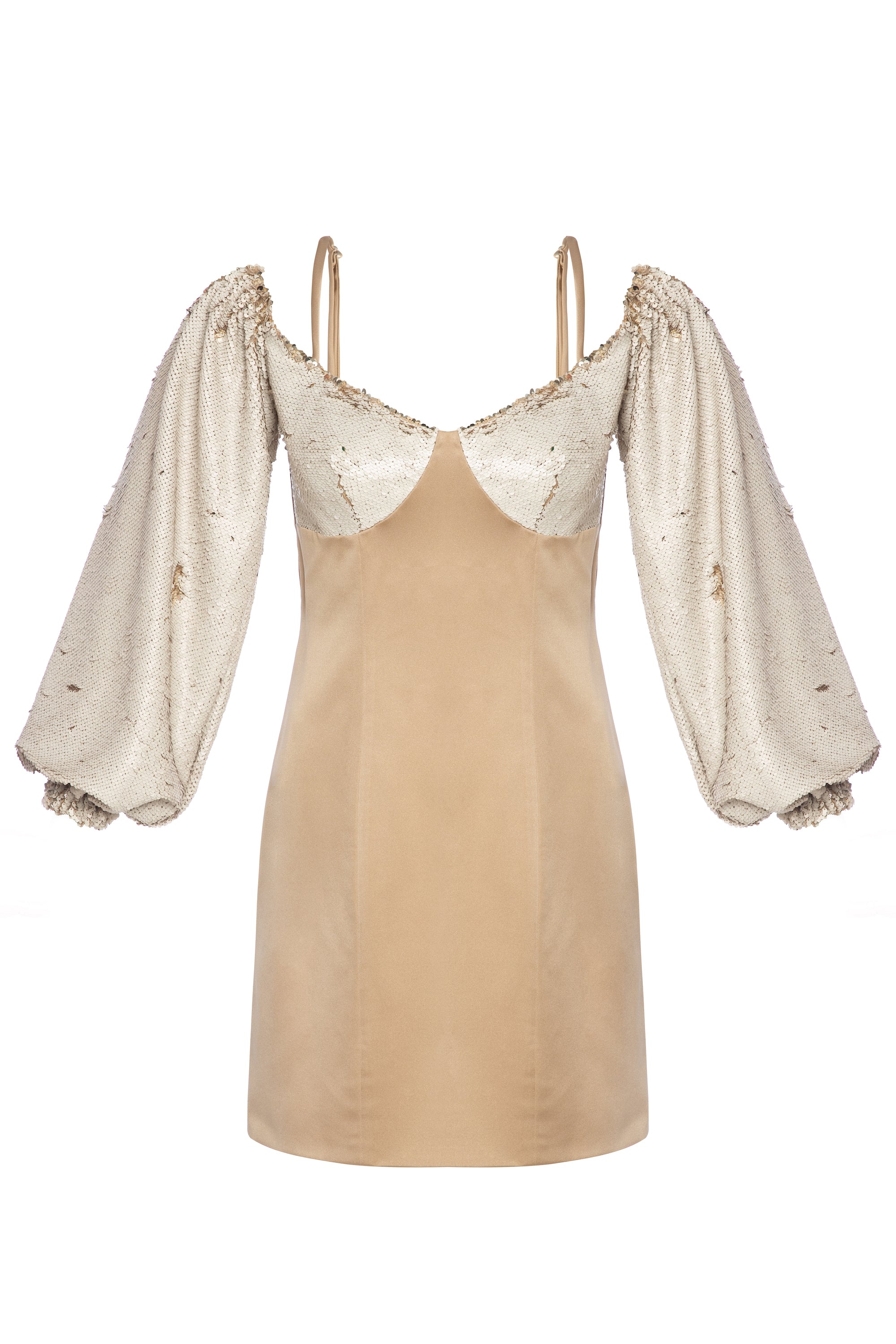 Dore Şeftali Payetli Düşük Omuzlu Elbise TİNA
