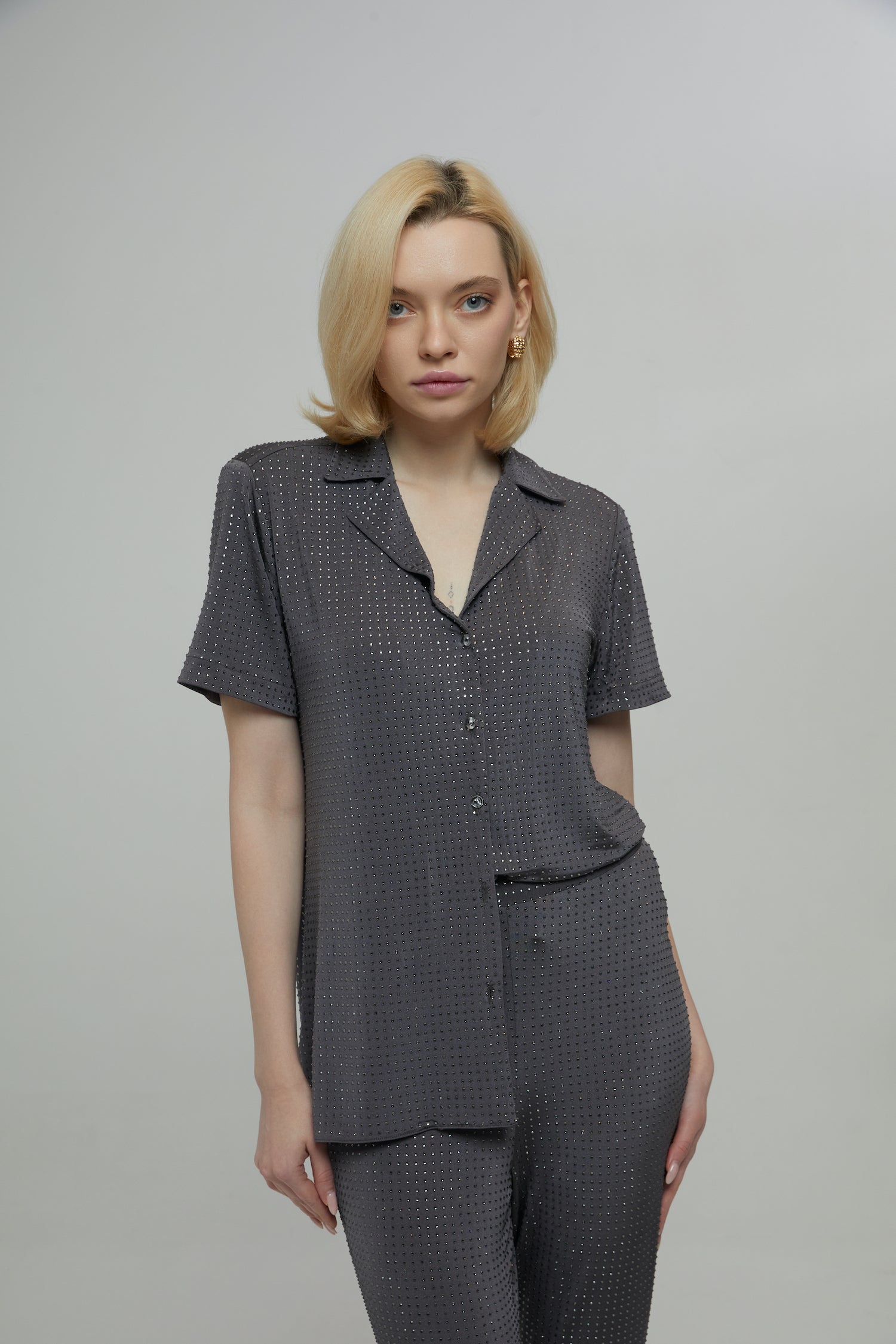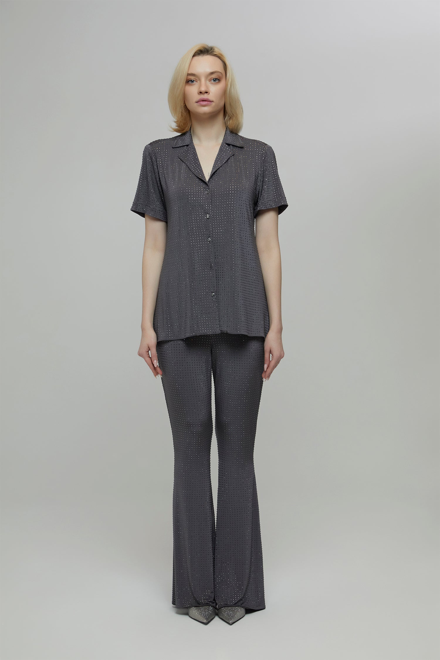 Gardırobunuzun vazgeçilmezi olmaya aday Takım . Işıltılı dokusuyla dikkat çeken Kırlangıç yaka tamamı taşlı likralı bol kesim tasarım gömlek modeli ve Pantolon takım . Yüksek bel likralı İspanyol paça pantolonun beli lastikli ve kolay kullanışlıdır. Sezonsuz bir takımdır . ister takım olarak kullanın ister ayrı ayrı parçalar olarak de kombin edebilirsiniz.