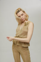 Asimetrik Gold Bluz, her detayında ince işçiliği ve yüksek kaliteyi hissettirir.
