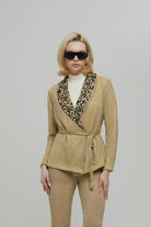 Şal Yaka Barok desenli ışıltılı  gold ceketimiz  belinde kuşak ile tamamlanmıştır . Esnek , likra içerir , üstelik tamamı astarlı olup rahat kombin edilebilir .  İster aynı dokuda İspanyol paça pantolonu ve anvelop blüz modelimiz ile 3 parça takım haline veya star parça olarak siyah veya bej basic kombinleriniz ile de kullanabilirsiniz .