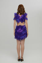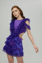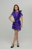 Çarpıcı mor rengiyle sofistike bir görünüm sergileyen fırfır detaylı mini elbise, gece davetlerinde göz alıcı bir stil vaat ediyor.Elbisenin yanlarında ve arkasında yer alan kesimler ile ince bir siluet görüntüsü sağlıyor . A Kesim eteğinin belinde ve elbisenin üst tarafında ince gizli lastik olması da elbiseye ayrı konfor sağıyor . Yandan gizli fermuarlı ve Astarlıdır.