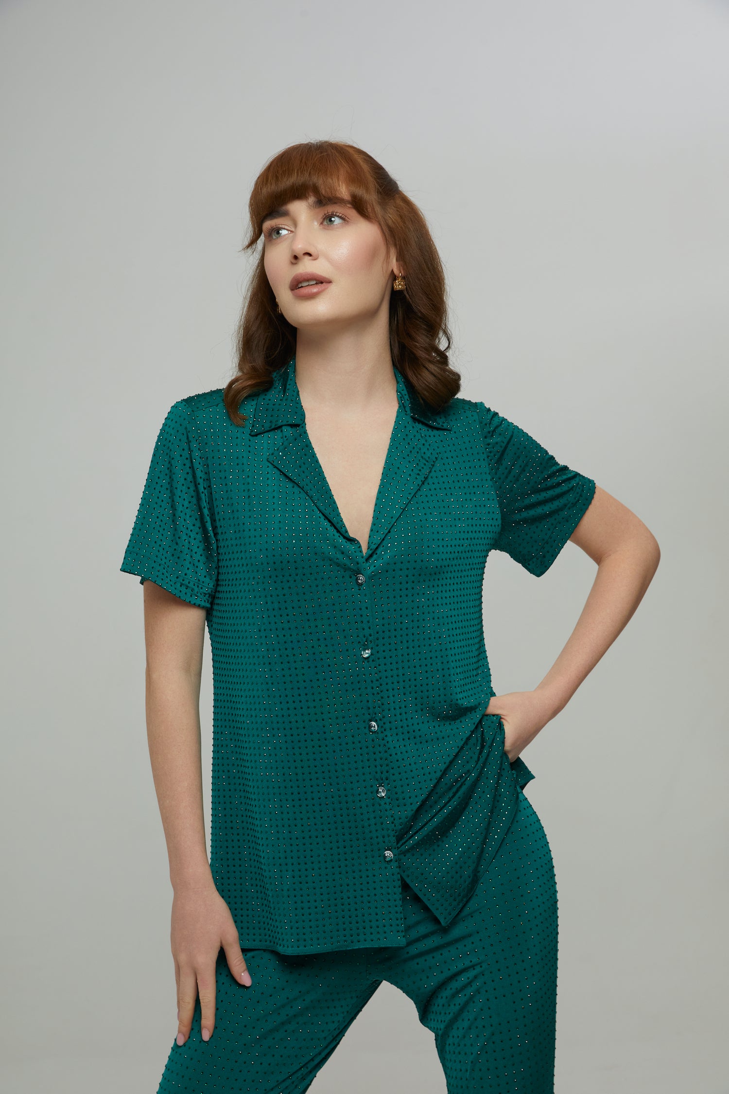 Işıltılı dokusuyla dikkat çeken Kırlangıç yaka tamamı taşlı likralı bol kesim tasarım gömlek modeli ve Pantolon takım .  Yüksek bel likralı İspanyol paça pantolonumuz esnek  kumaşı sayesinde bedeni zarifçe sarar . Yoğun rengi ve ışıldayan taşları ile tek adımda iddialı bir stil yaratır. Pantolonun beli lastikli ve kolay kullanışlıdır. Sezonsuz bir takımdır . Şık gece ve davetler için ideal bir seçimdir.