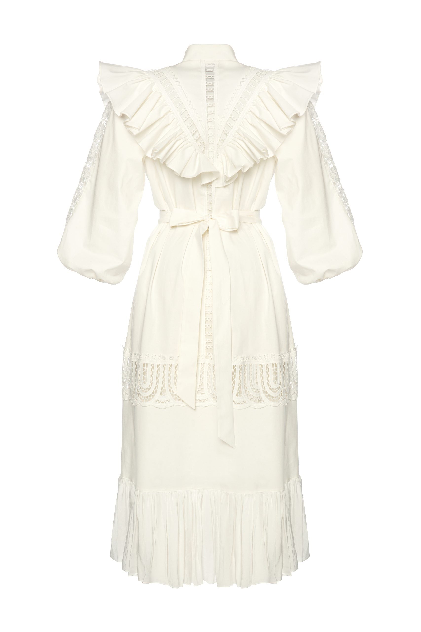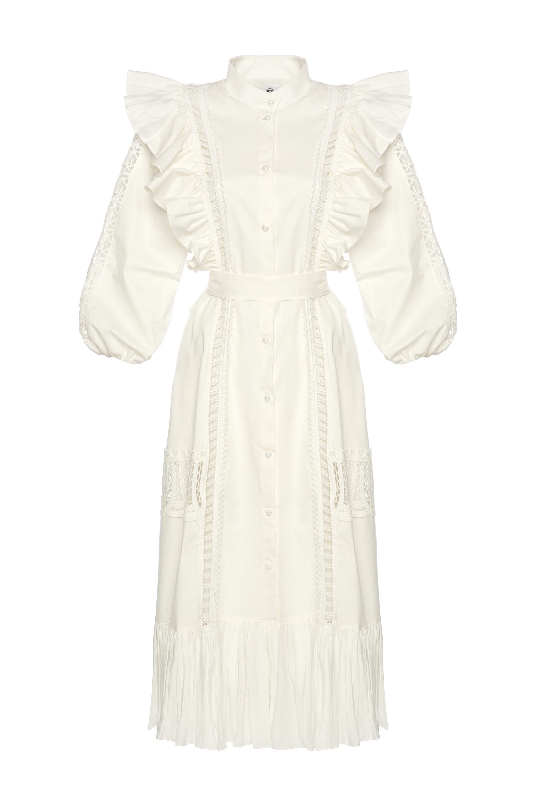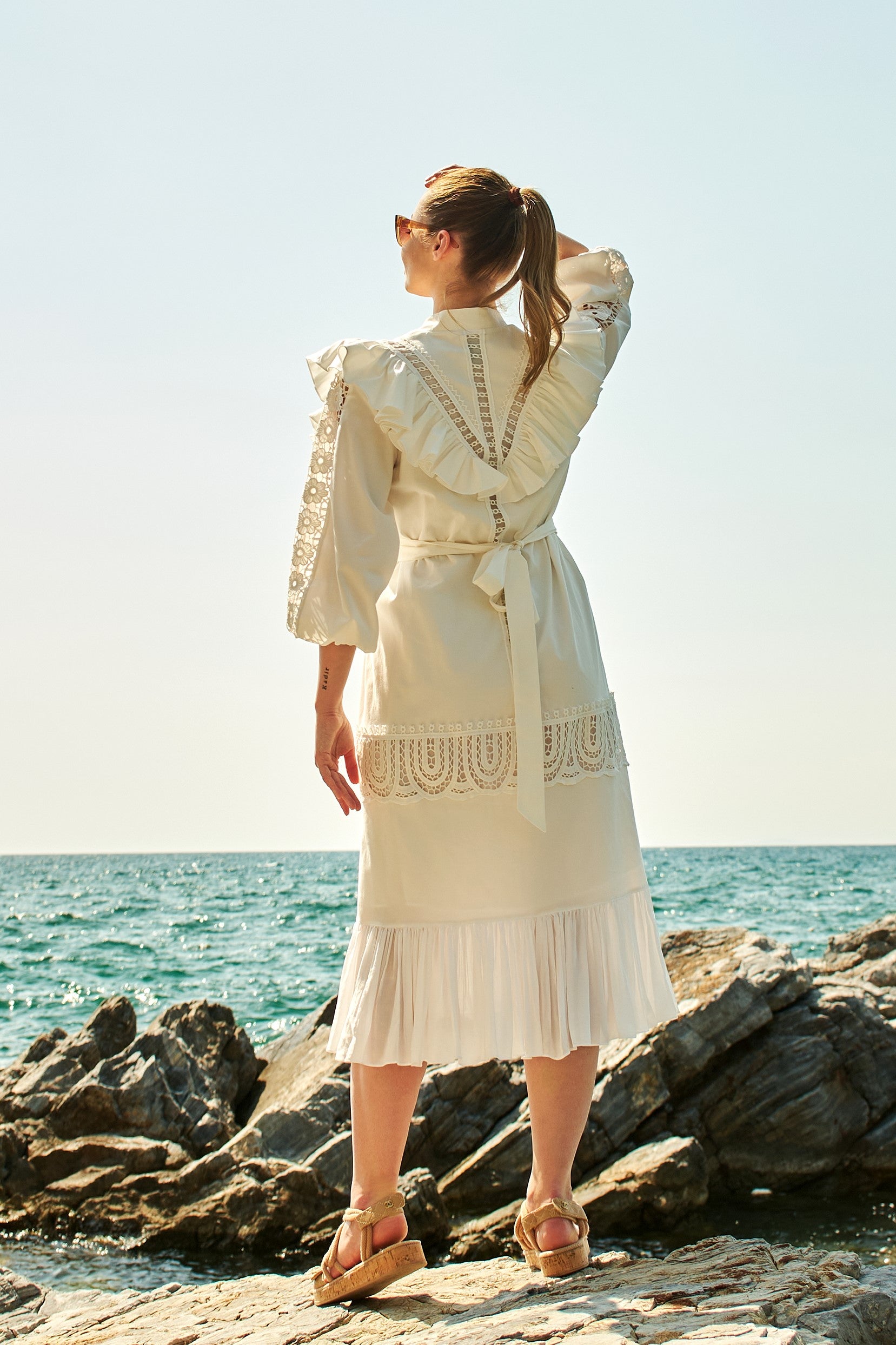 Soğuk ilkbahar ve yaz geceleri için mükemmel bir elbise. Tamamı pamuk kumaşından üretilmiştir . Fırfırlar ,etekteki volanlar ve tüm elbisede bulunan dantel detaylar elbiseye ayrı şıklık katıyor üstelik önü tamamen açılabilir düğme detaylı . A- kesim elbiseye daha fazla rahatlık kazandırıyor . Kemerli veya kemersiz de kullanabilirsiniz. Astarlıdır ,iç göstermez . Bu şık ve feminen elbise modeli , Serin yaz / bahar davetlerin vazgeçilmez ürününüz olacaktır . Şıklık aynı zamanda çok rahat da olabilir , kokteyllere kadar çeşitli etkinlikler için ideal bir seçenektir.