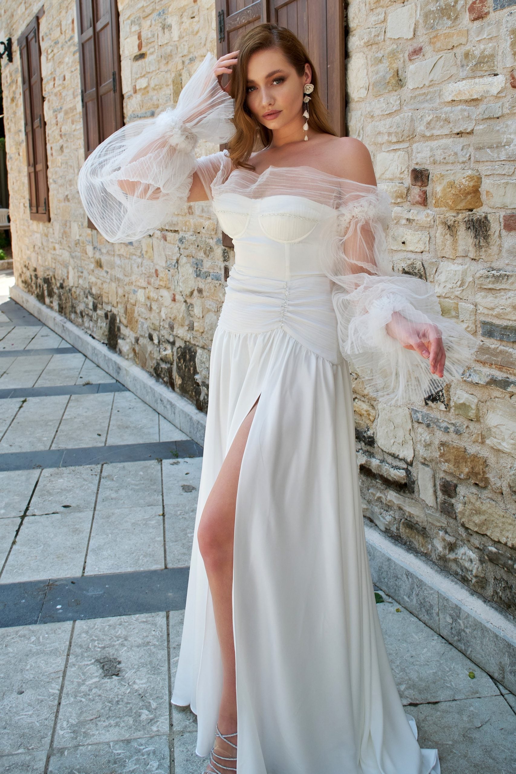 İpek satenin doğal ışıltısı ve uçuş uçuş dokusuyla tasarlanan bu özel gelinlik, göz alıcı detaylarıyla büyüleyici bir siluet sunar. Düşük omuz kesimi ve korse yapısı, zarif bir duruş sağlarken; büstiyer ve drape bölgesinde yer alan ince el işleme detayları tasarıma sanatkâr bir dokunuş katar. Ön kısmındaki asimetrik yırtmaç, yürüyüşe hafif bir cesaret katarken, çıkartılabilir kollar sayesinde hem klasik hem modern görünümlere kolayca uyum sağlar. Zarafeti ve özgünlüğü bir arada taşımak isteyen gelinler için tasarlandı.