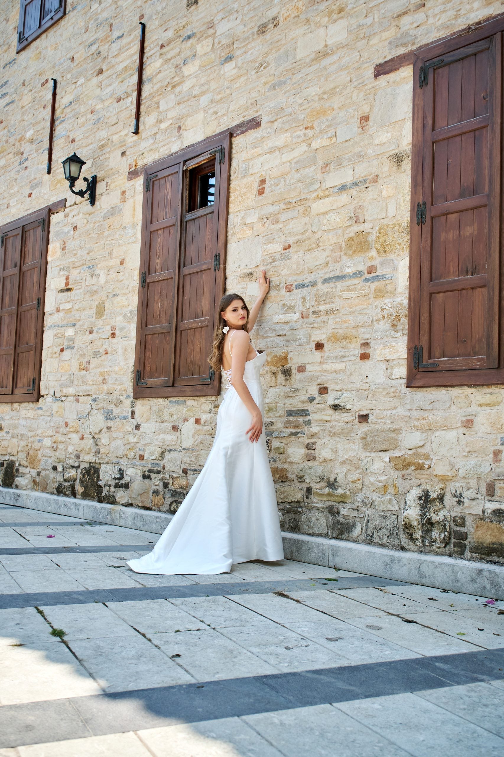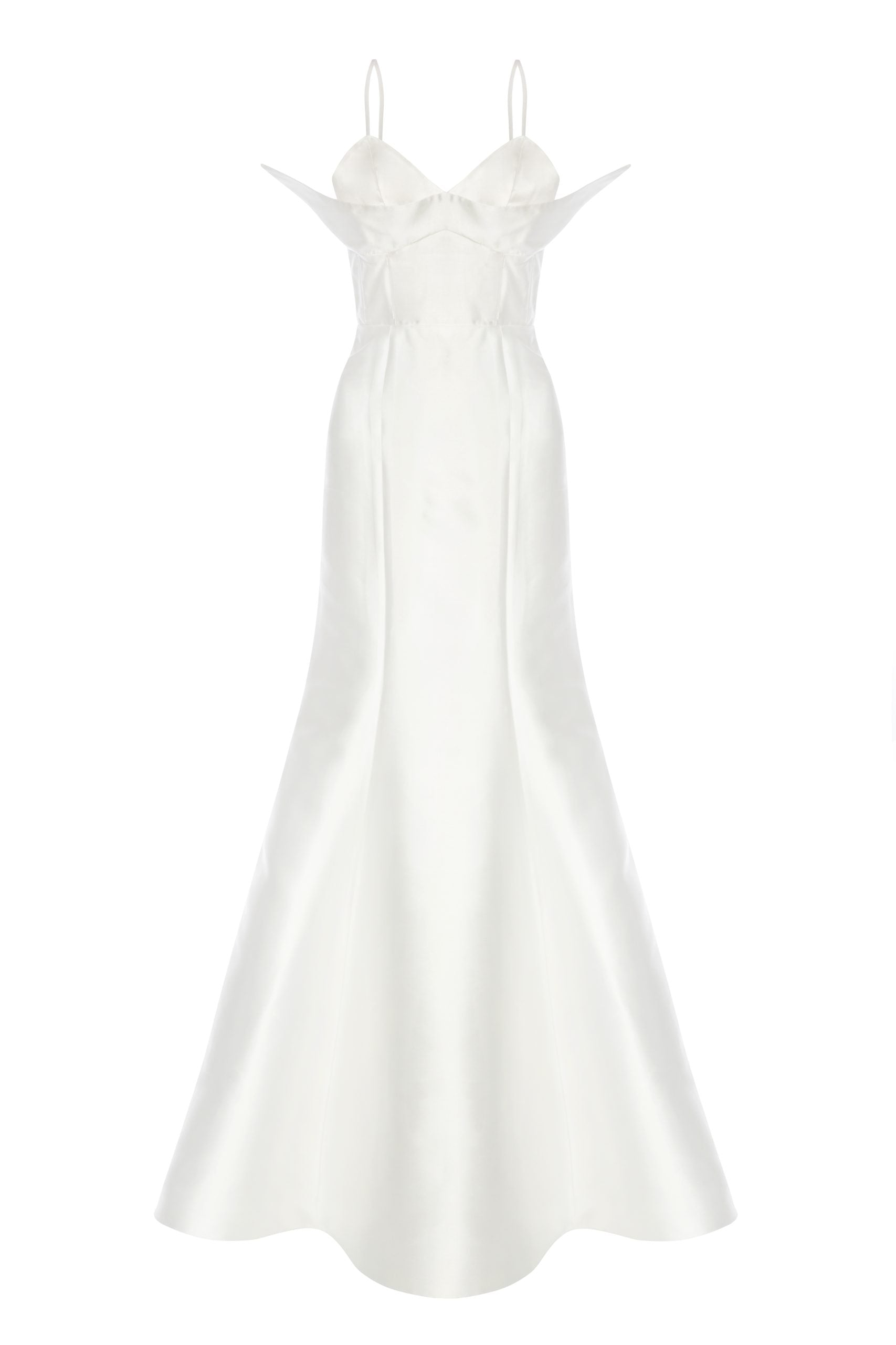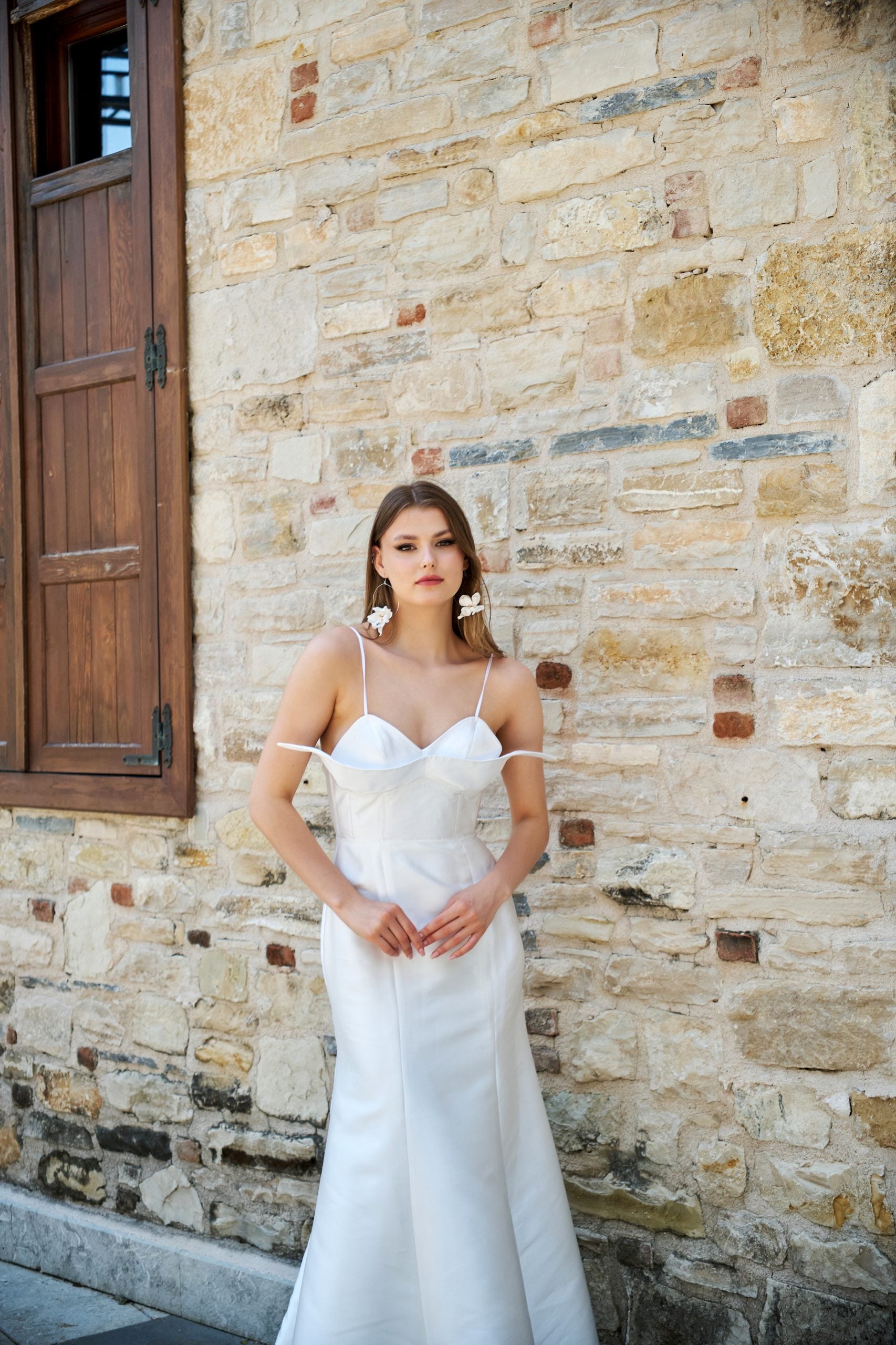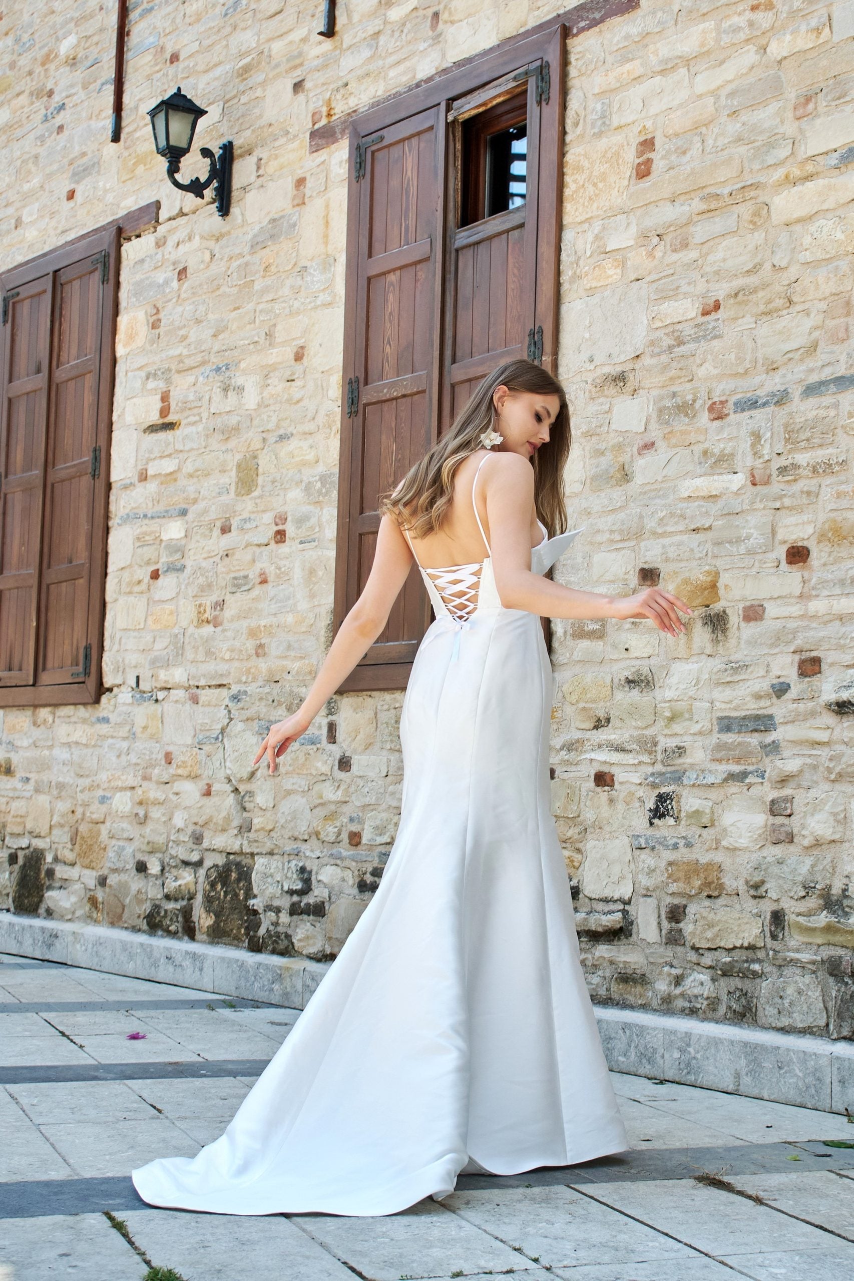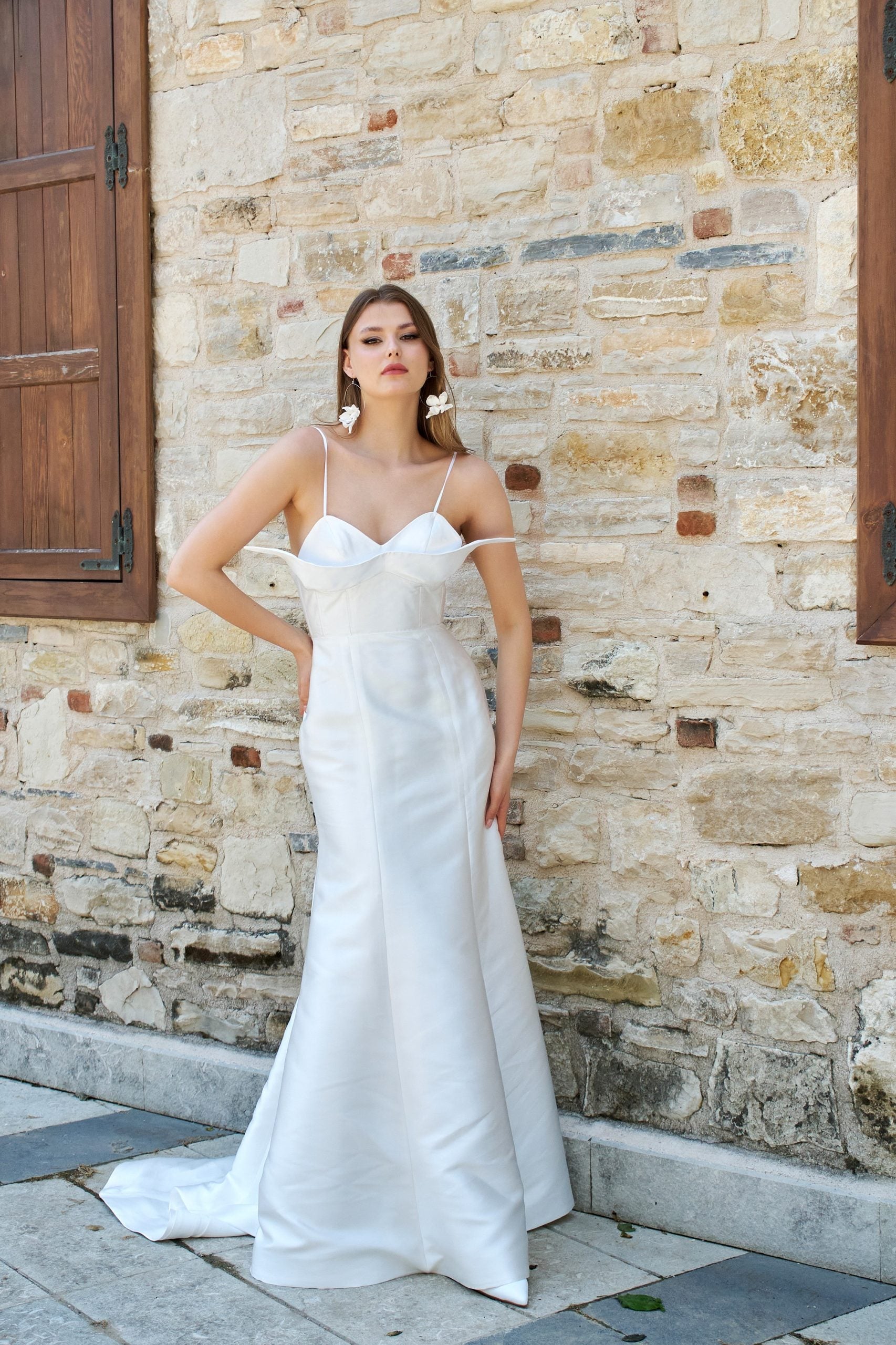 Modern çizgiler arayan gelinlere özel avangart korse detaylı gelinlik modelimiz . Modern asimetrik kesim detaylı büstiyer ve arkada bağlama detaylı korsesi ile, dar kesim balık eteği, tırtıklı parlak dokudan oluşan ithal Mikado kumaşından üretilmiştir. Balık kesim olmasına rağmen eteğin kuyruğu rahat hareket kabiliyeti olması için kalıbı özel olarak tasarlanmıştır. Astarlı ve likrasızdır.