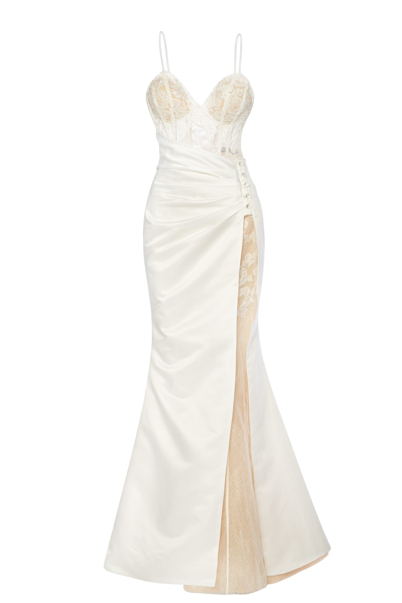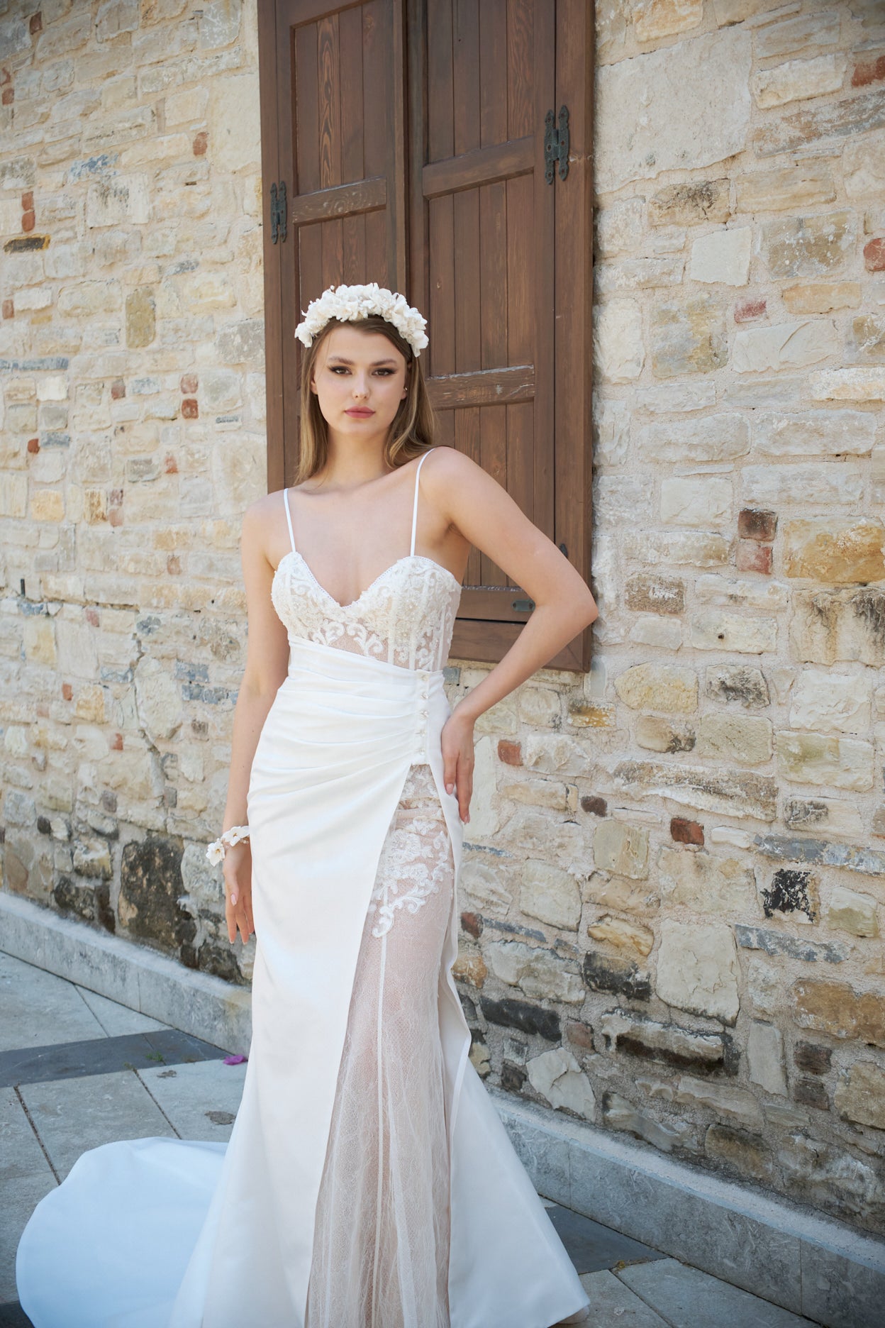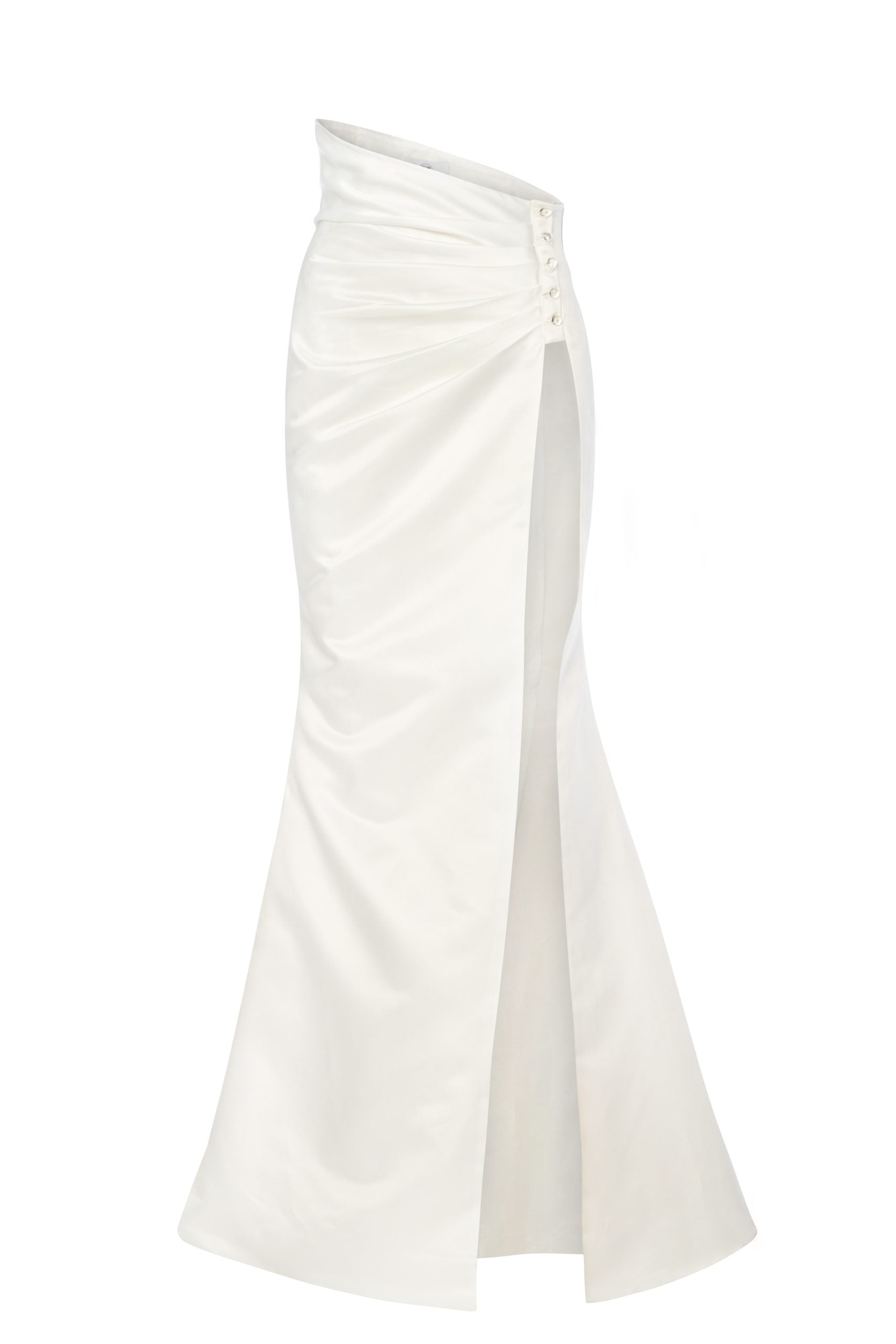 Asimetrik önde düğme detaylı , kolay çıkartılabilen, yüksek bel, kuyruklu transformer etek Thalia. İşleme detaylı gelinliğimiz Thalia ile birlikte giyildiği zaman gelinliğinize ayrı hava katacak önündeki derin yırtmacı da hareketlerinizi kısıtlamayacaktır. Üstelik bu modeli sayfada gördüğünüz her hangi bir kısa elbise veya etek ile sipariş üzerine kombinleyebilir, kendi tarzınızda bir gelinlik oluşturabilirsiniz . Sipariş üzerine üretilir (LİMİTED EDİTİON )