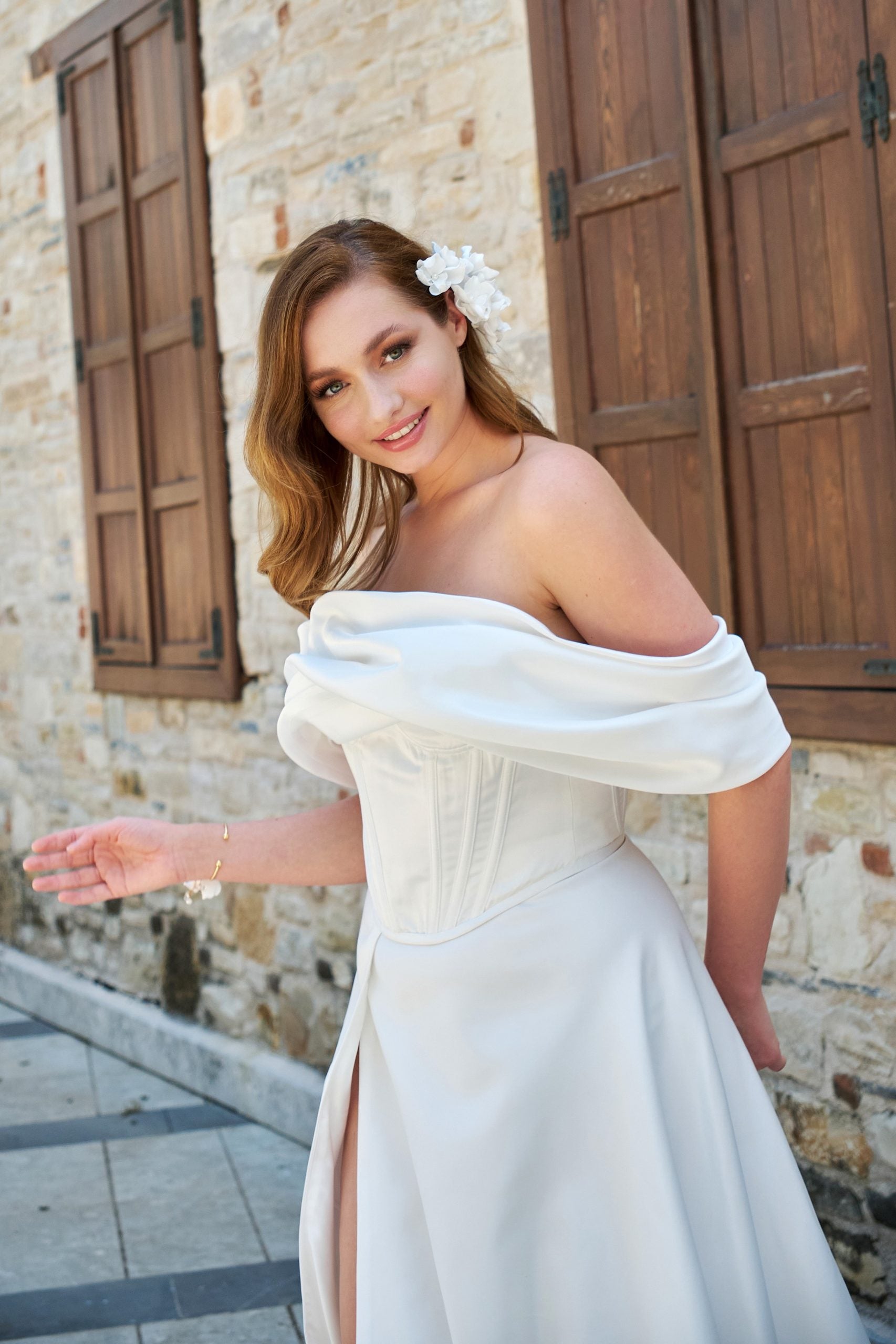 İster Tek omuzda asimetrik ,ister çift tarafı düşük omuzda giyilebilen drape detaylı modern korse büstiyer , sade ve Şık A-kesim eteğinde , asimetrik bir yırtmaçla tamamlanmıştır . Bu ikili takım düğün gününüzden sonra da farklı davetlerde veya partilerde başka ürünlerle kolaylık ile ayrı ayrı giyebileceğiniz 2 parçalı mükemmel bir set olacak.