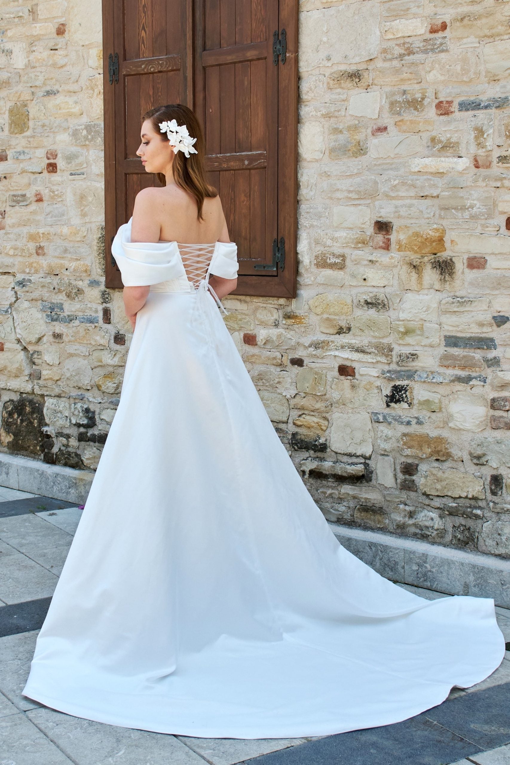 Drapeli Düşük Omuzlu A Kesim 2 Parça Büstiyer ve Etek Gelinlik Mila